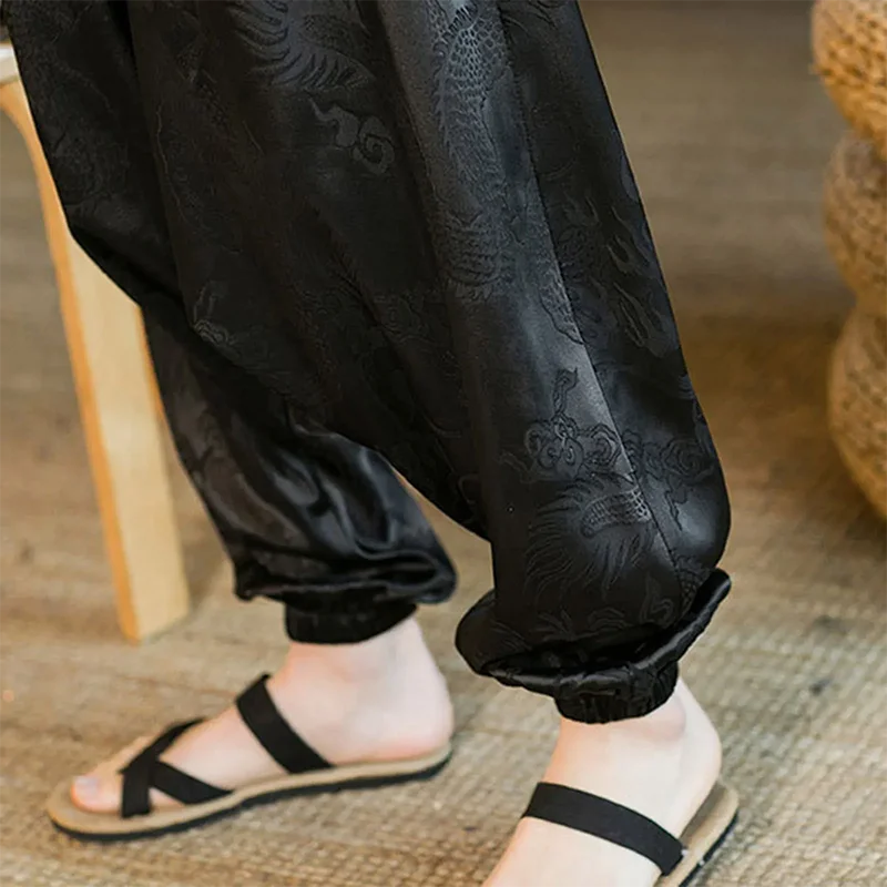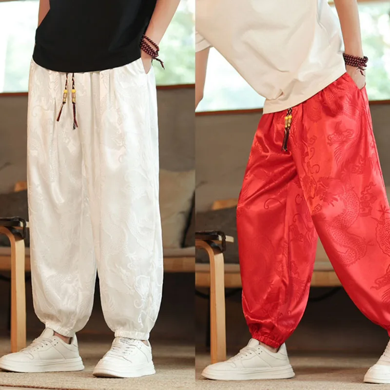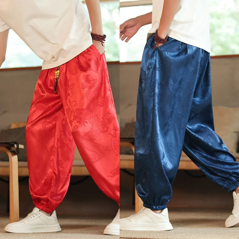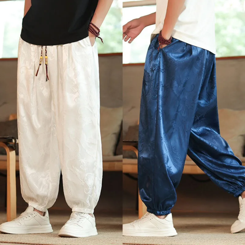 Pantalones de verano para hombre, pantalones informales Harajuku, pantalones de pierna ancha de estilo japonés, ropa de calle fina holgada de seda helada, pantalones de chándal holgados para correr