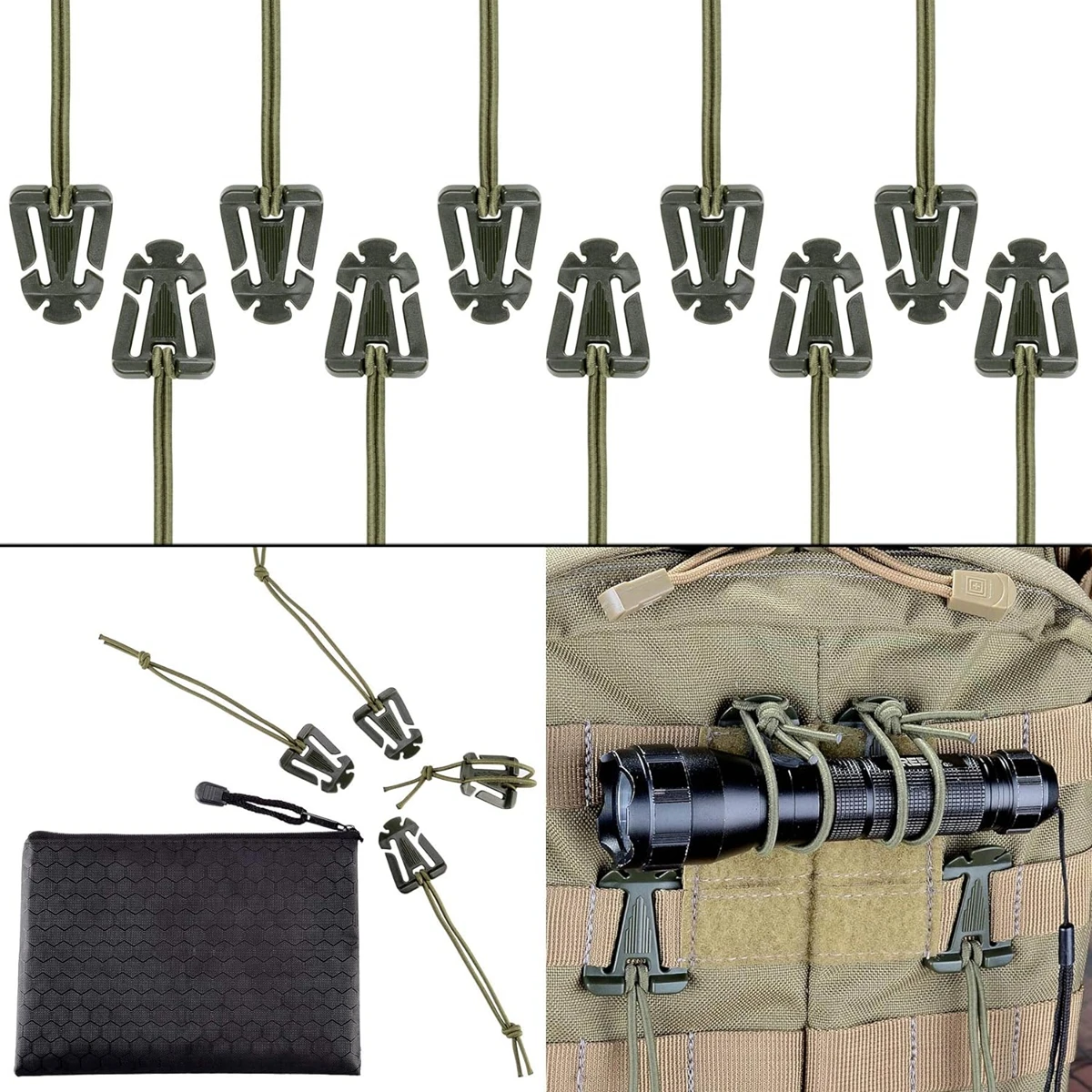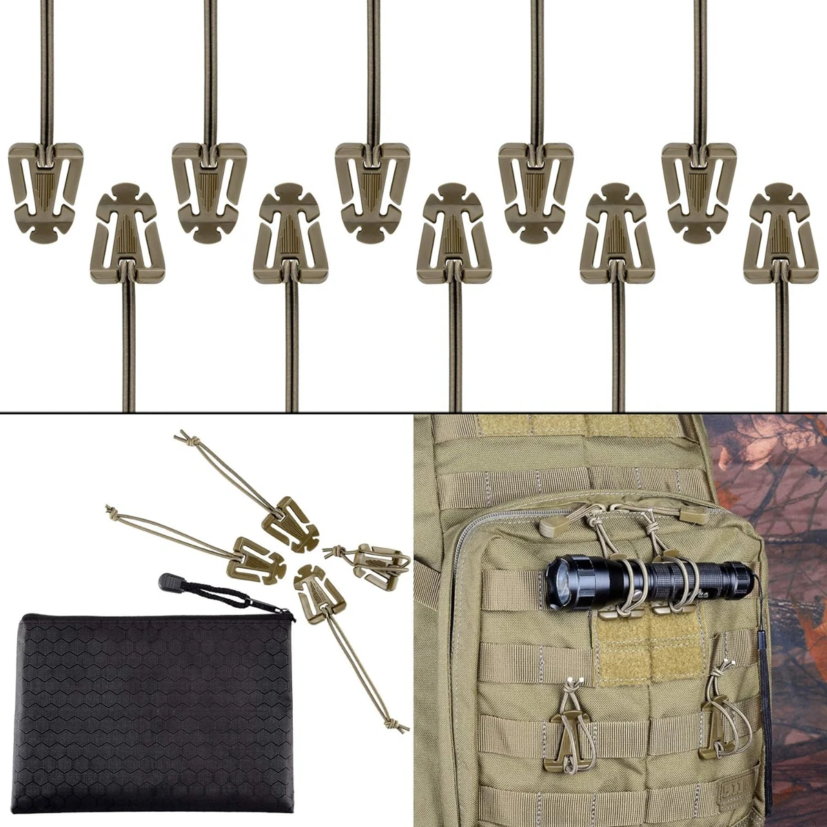 Paquete de 10 dominadores de Web Molle con Clip de engranaje táctico para exteriores, tubo de hidratación, mochila, gestión de correas con bolsa con cremallera