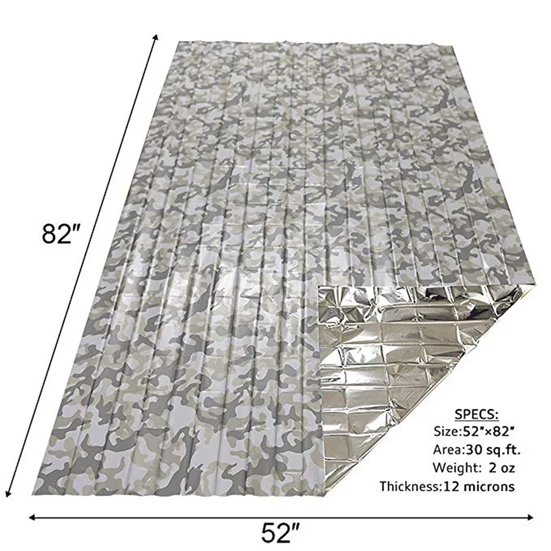 2. Rescate de emergencia: hecha de fibra de poliéster de polietileno aluminizada de 12 micras, cada manta mide 52x82" y pesa 53 g, lo que refleja hasta el 90% del calor corporal.Adecuado para la creación de refugios de emergencia rápidos y ayuda a prevenir el frío o los golpes en condiciones climáticas extremas.
