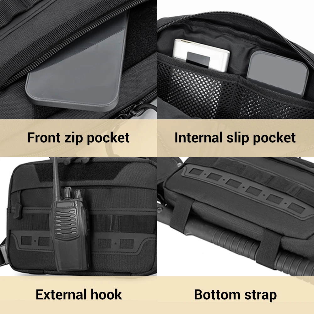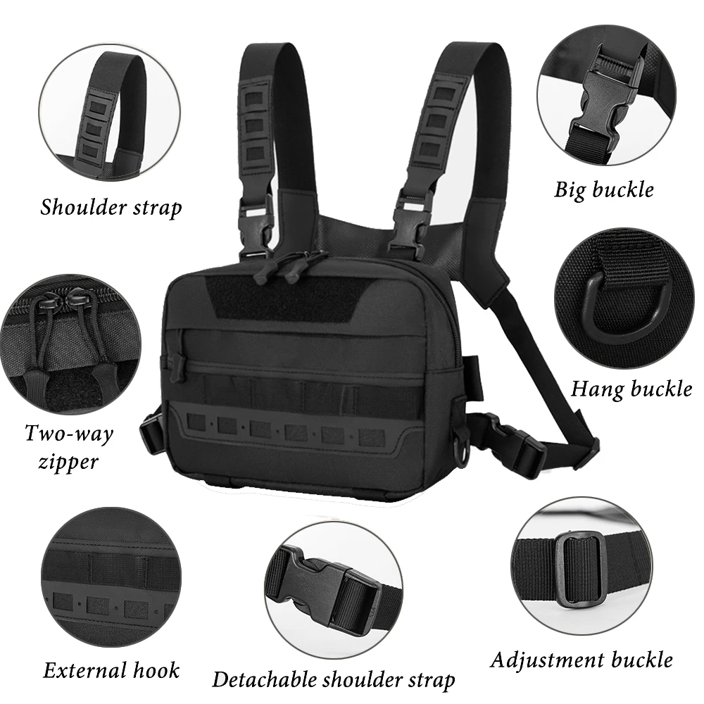 La bolsa de pecho tiene un tamaño compacto de 9,45 pulgadas de largo x 7,09 pulgadas de alto x 3,15 pulgadas de ancho. Está equipada con un sistema molle, es fácil colocar suministros adicionales según sea necesario para aumentar la capacidad de carga.