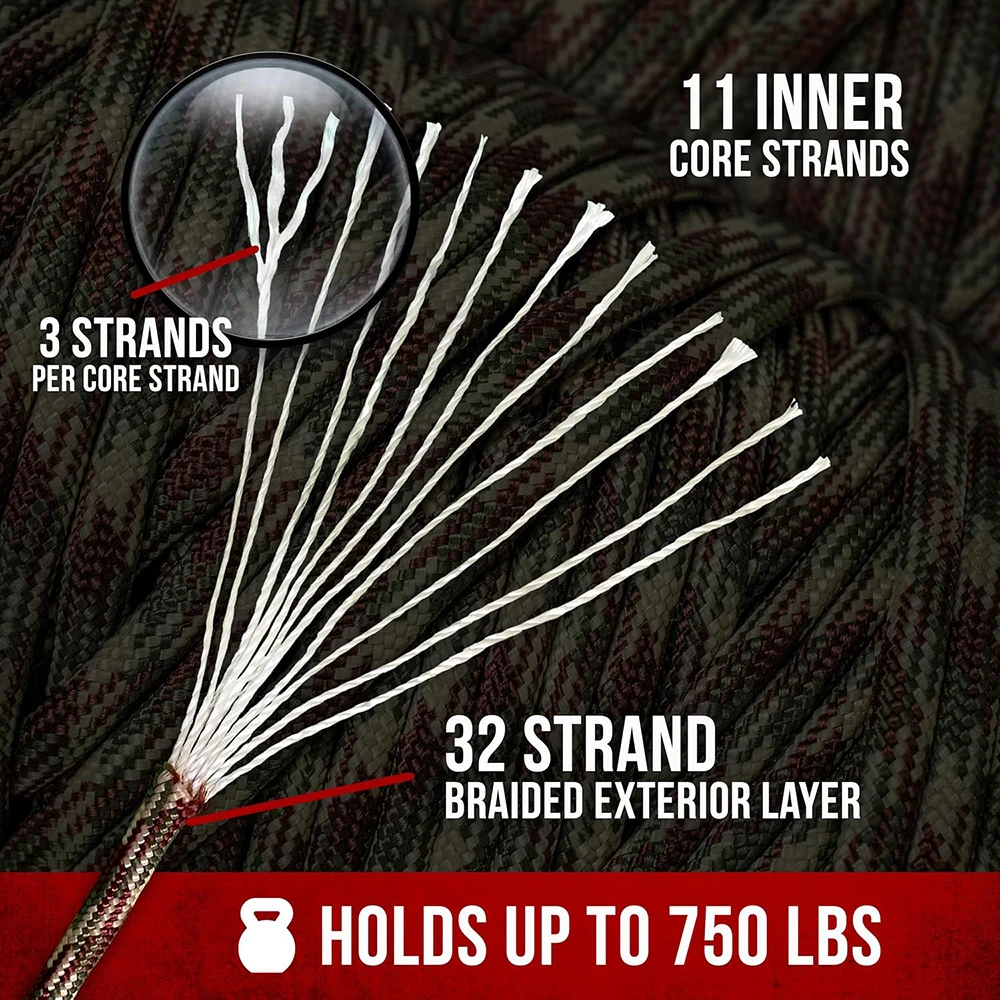 2.【 Fuerza de 750 lb】 Con una fuerza de soporte de hasta 750 libras, este paracord de supervivencia es fuerte y confiable, lo que le brinda tranquilidad. El núcleo está construido a partir de 11 hebras internas que están hechas de 3 hebras individuales cada una, lo que proporciona una amplia resistencia para un uso sin fin.