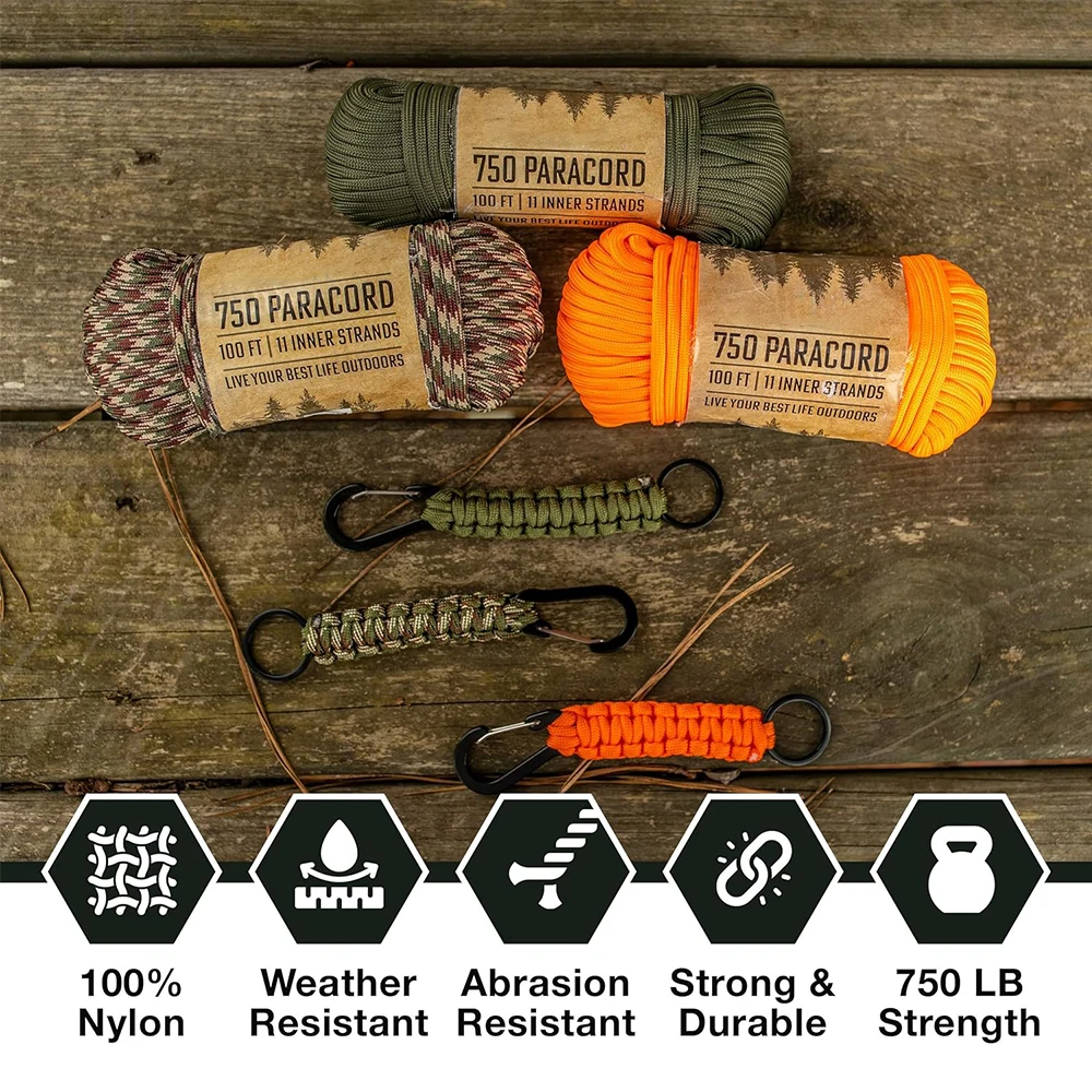 6. 【Disponible en tres longitudes populares】 50 pies, 100 pies e incluso un carrete de 200 pies para satisfacer sus necesidades específicas. Ofrecemos tres atractivas opciones de color que son las favoritas entre los entusiastas: paracord verde oliva, paracord de camuflaje y paracord naranja.