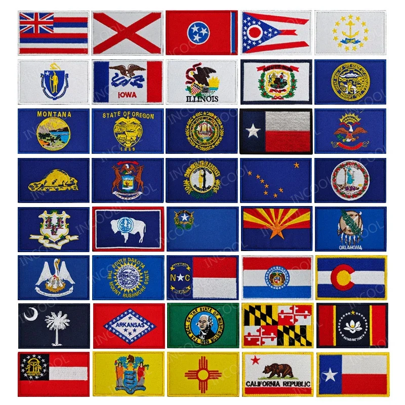 [Especificación]:Estados Unidos California Texas Nevada Virginia Nebraska Oregon Alabama Bandera del Estado Parche EE. UU. Parches bordados Apliques