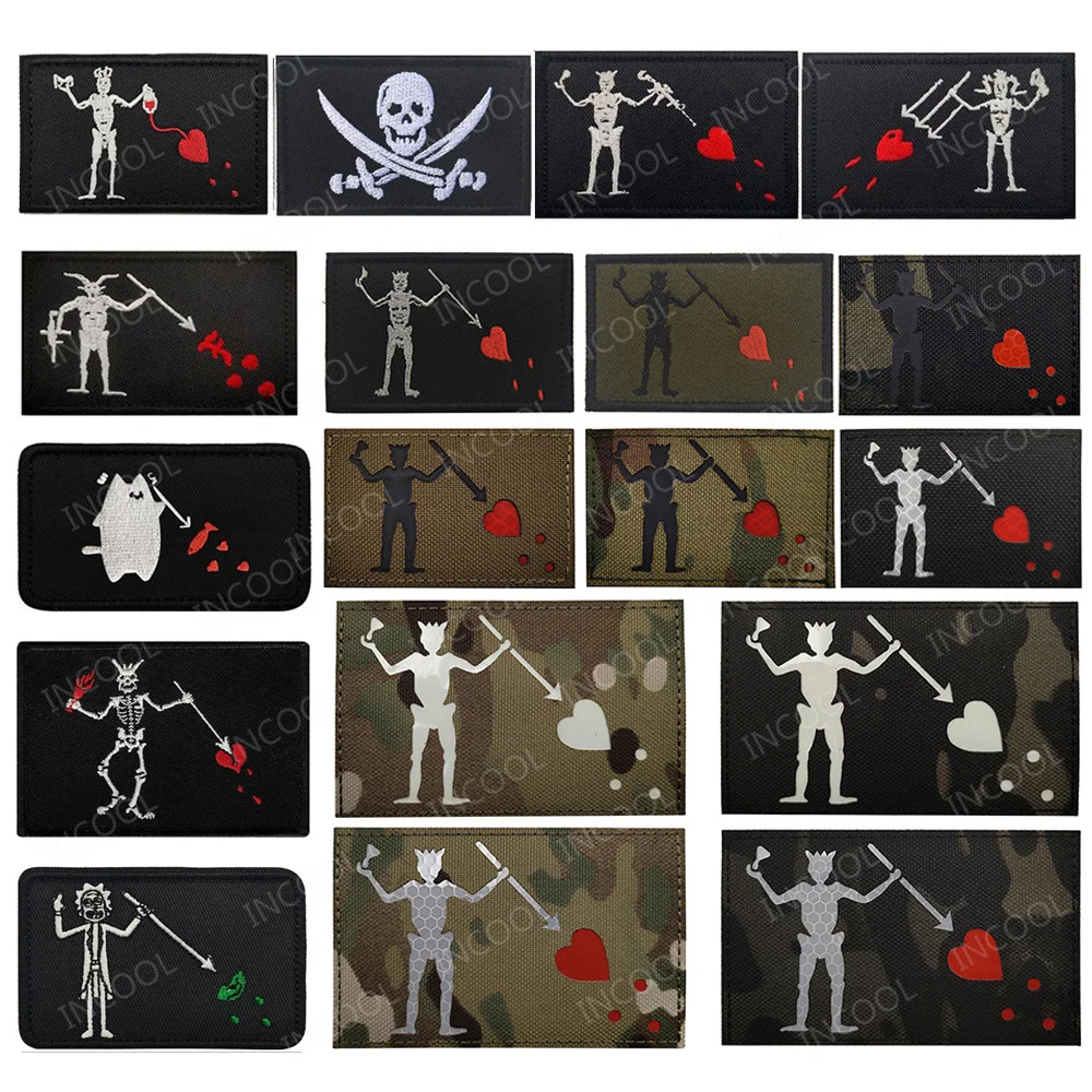 [Especificación]:Parche bordado de barba negra Edward Teach Blackbeard Pirata reflectante Jolly Roger Skull Heart F Esqueleto Dedo Insignia luminosa