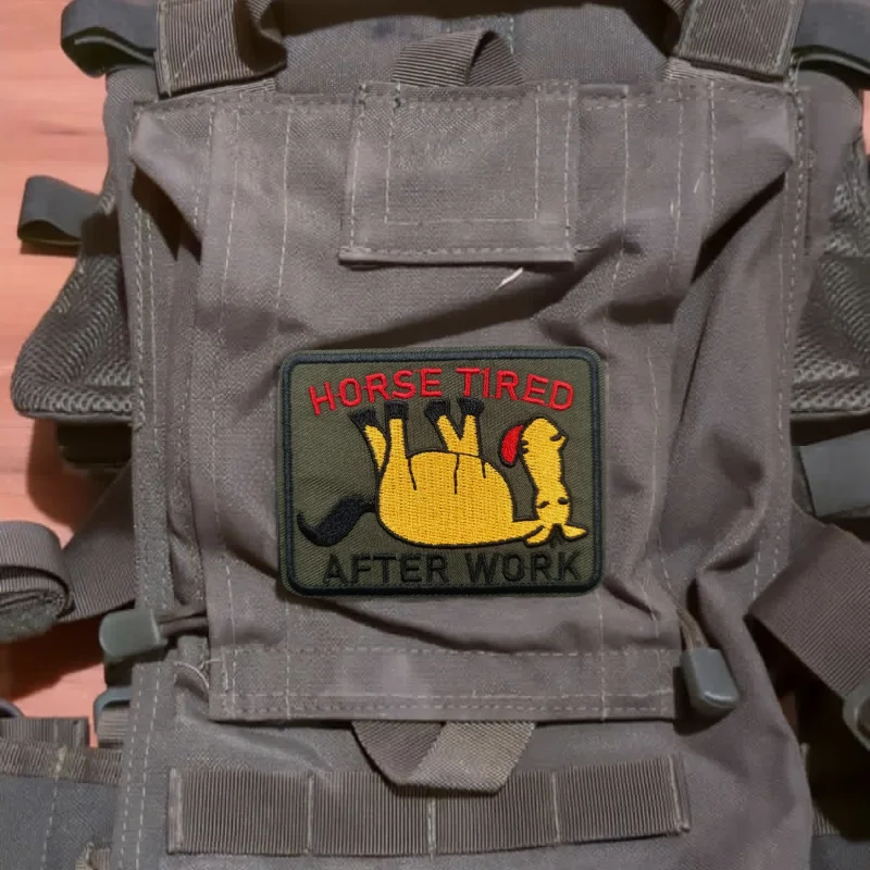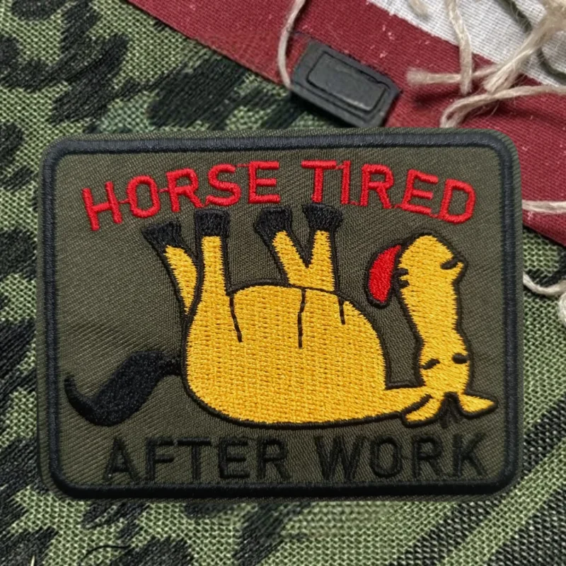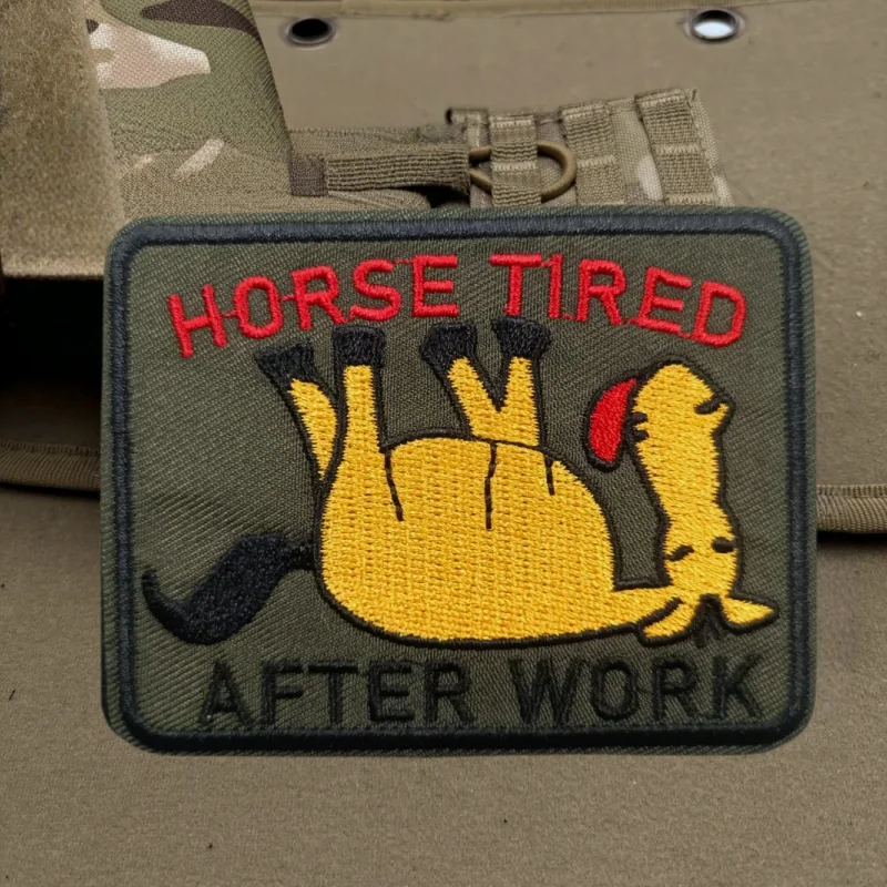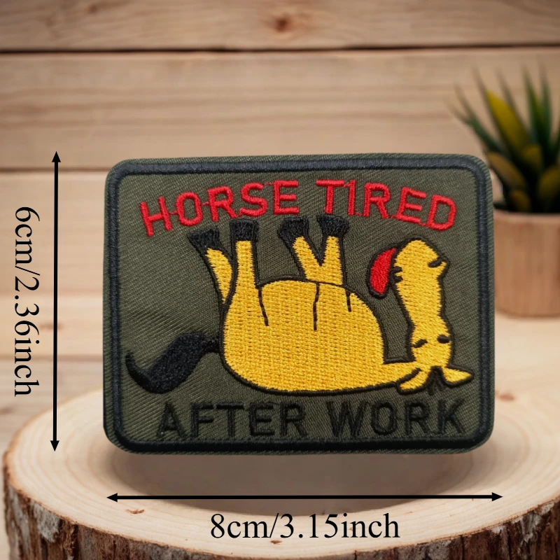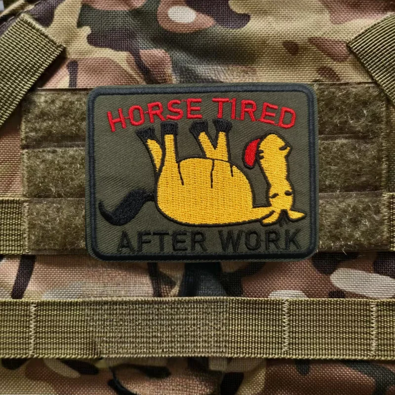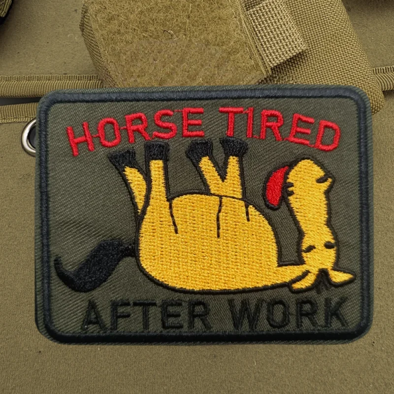 Parche bordado de caballo cansado después del trabajo, chaleco táctico, sombreros con gancho y bucle, insignia de moral, pegatinas para mochila, parches para abrazadera para ropaNOTA:1.Diferentes computadoras muestran los colores de manera diferente, el color real del artículo puede variar ligeramente del de las imágenes.