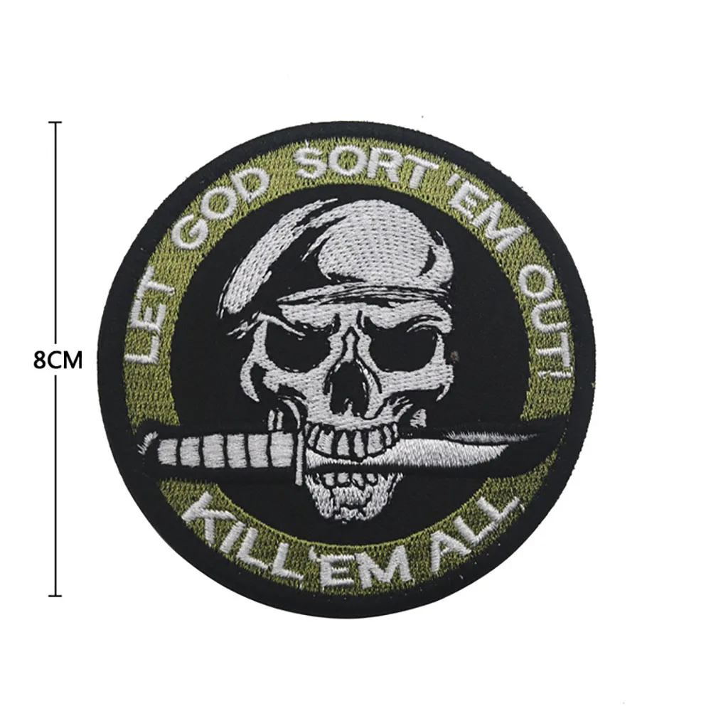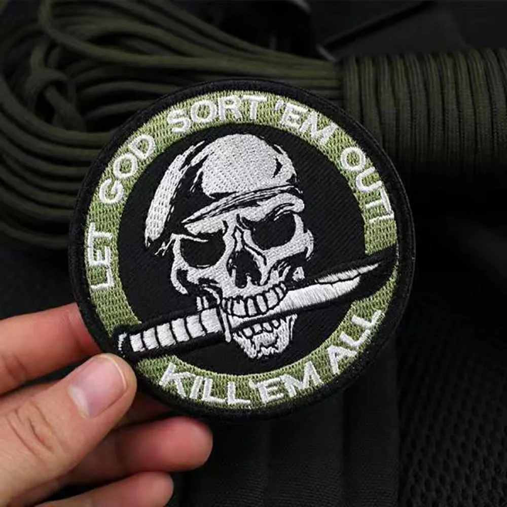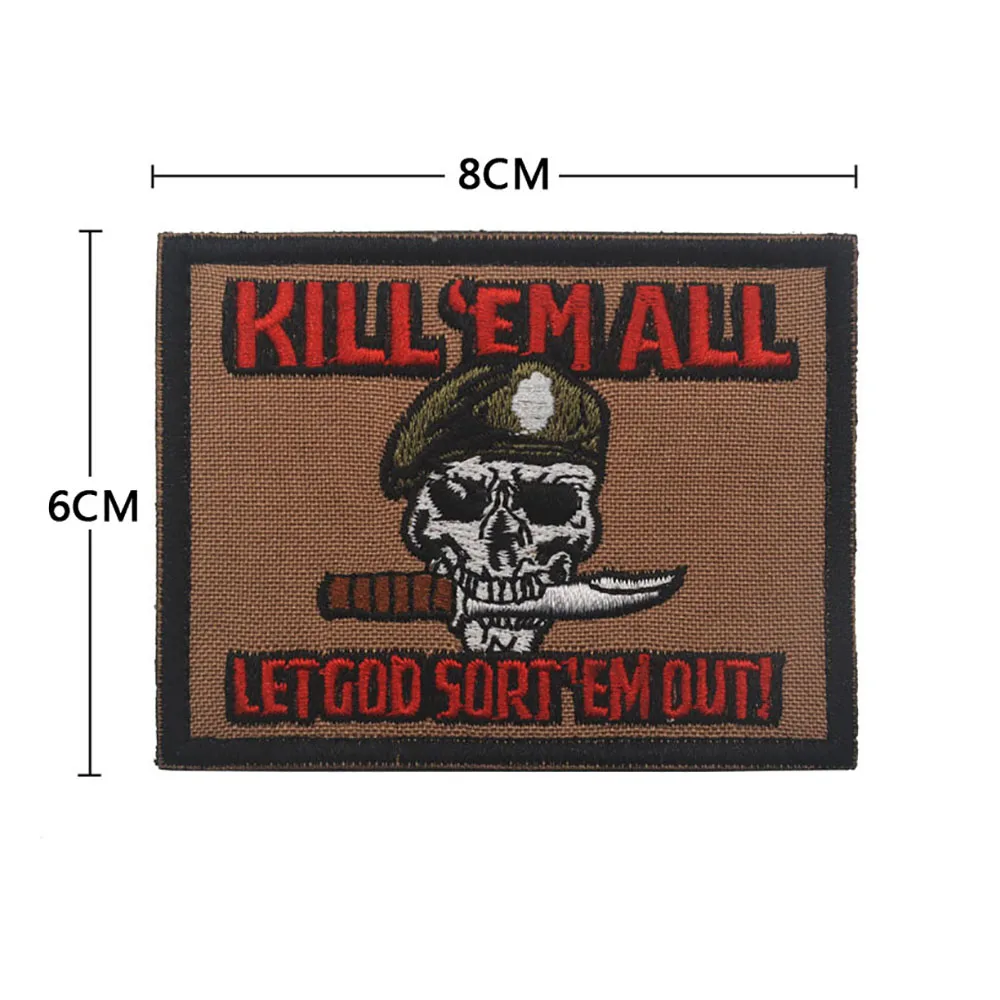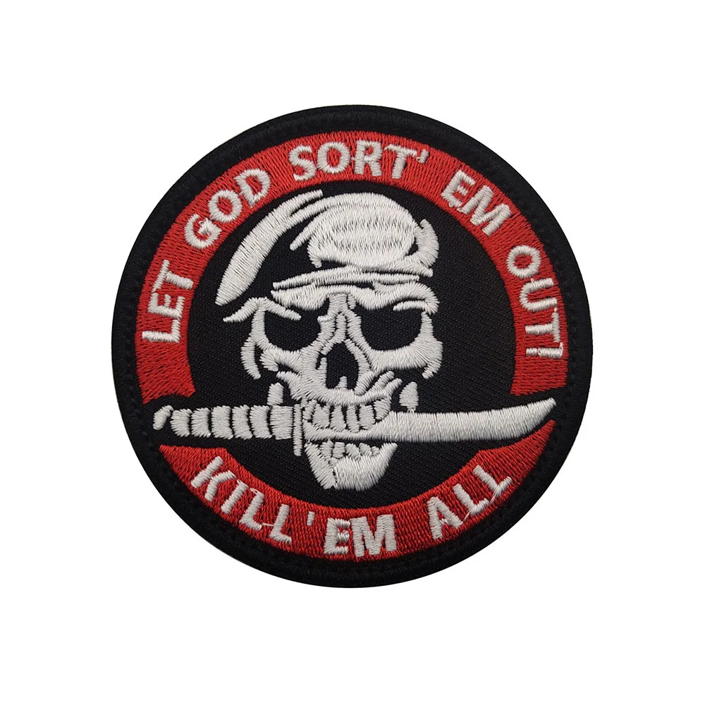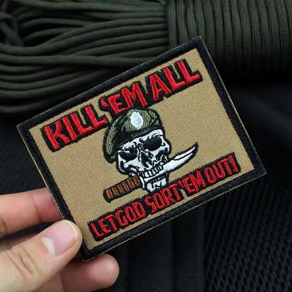 Parche bordado de Kill Em All Let God Sort Em Out, insignia de moral, apliques militares, parches tácticos de bucle de gancho en la etiqueta engomada de la ropa