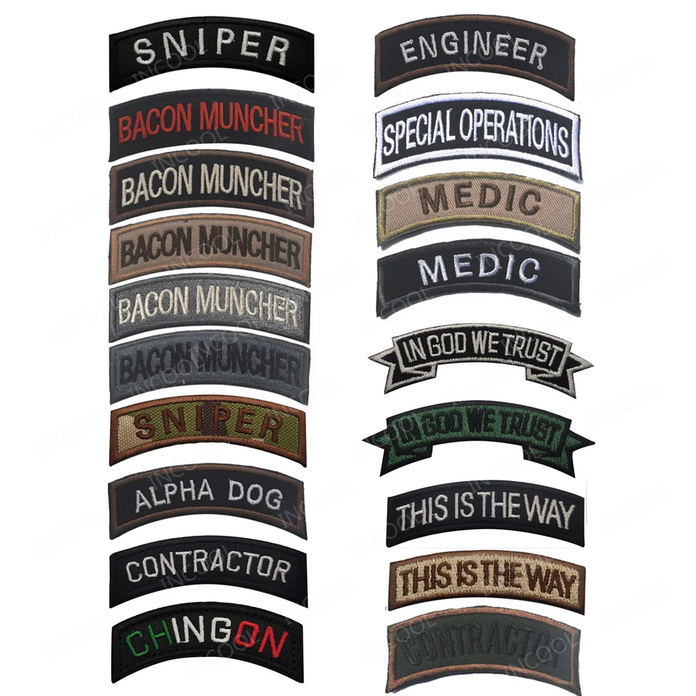 [Especificación]:Parche bordado con lengüeta para hombro de contratista de ingeniero médico de francotirador en Dios confiamos insignias Ranger operaciones especiales apliques de parche