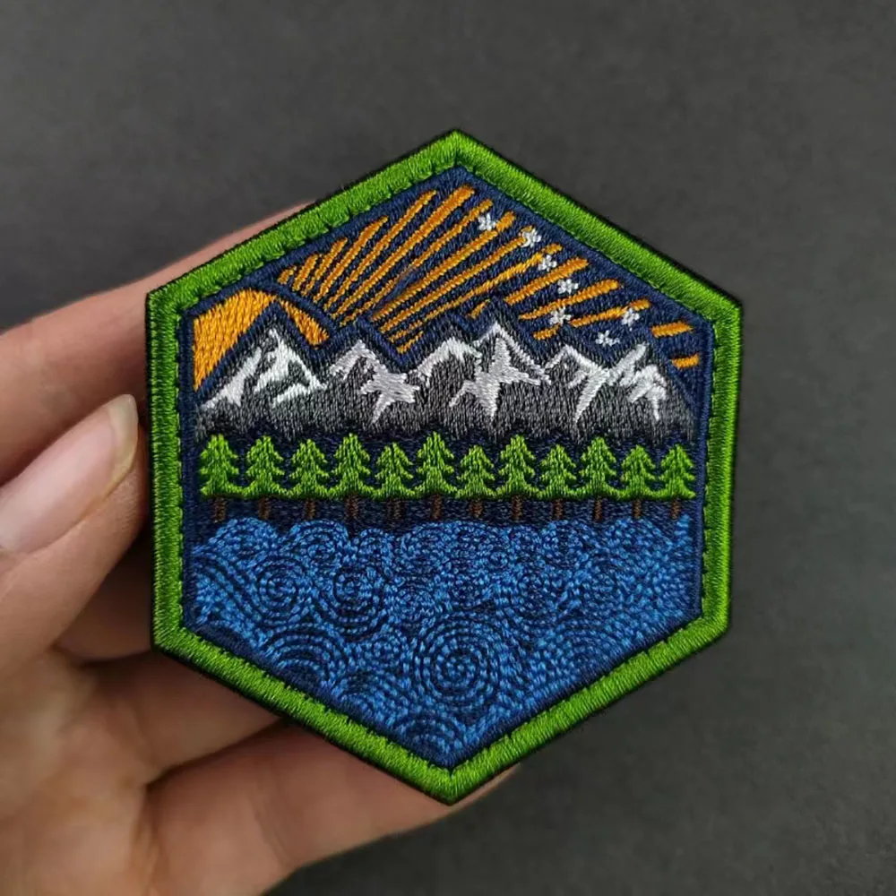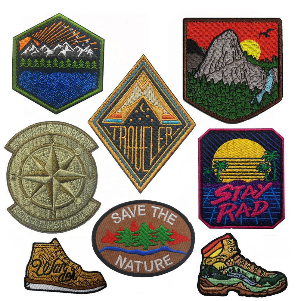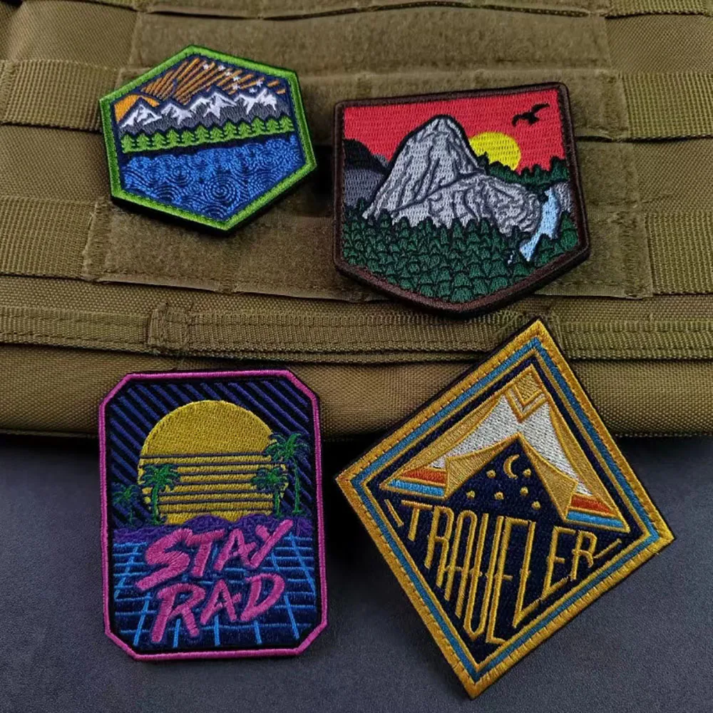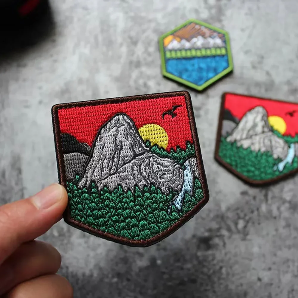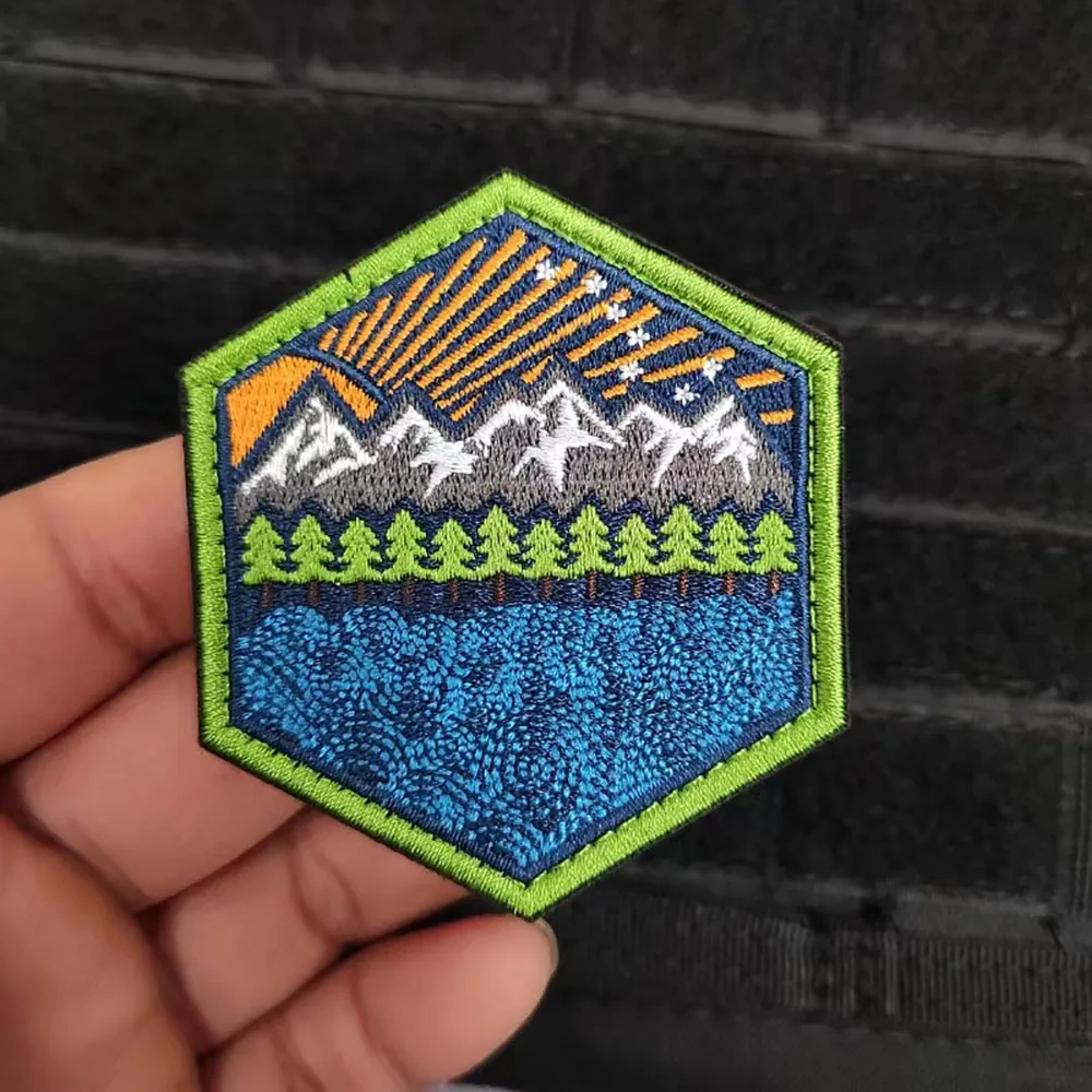 Parche bordado de tienda de Amanecer Natural al aire libre, insignias de moral táctica de campamento Explore, parches de senderismo de aventura de bucle de gancho en la ropa