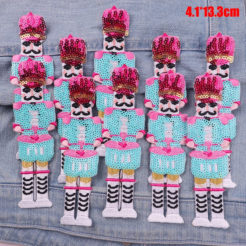 10 Uds., venta al por mayor, parche de Cascanueces bordado con lentejuelas, parches de hierro para ropa, chaquetas, parche de costura DIY de soldado King de dibujos animados