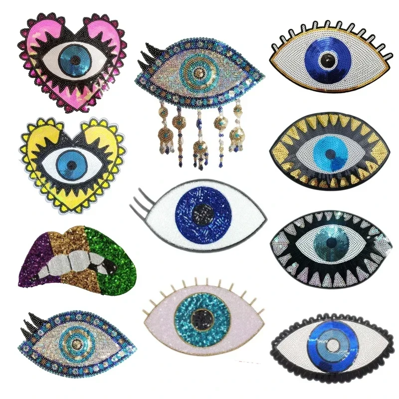 Parche de corazón de ojo de lentejuelas, parches de hierro para mal de ojo, accesorios de ropa cosidos, apliques de labios, pegatina bordada de lentejuelas para ropa