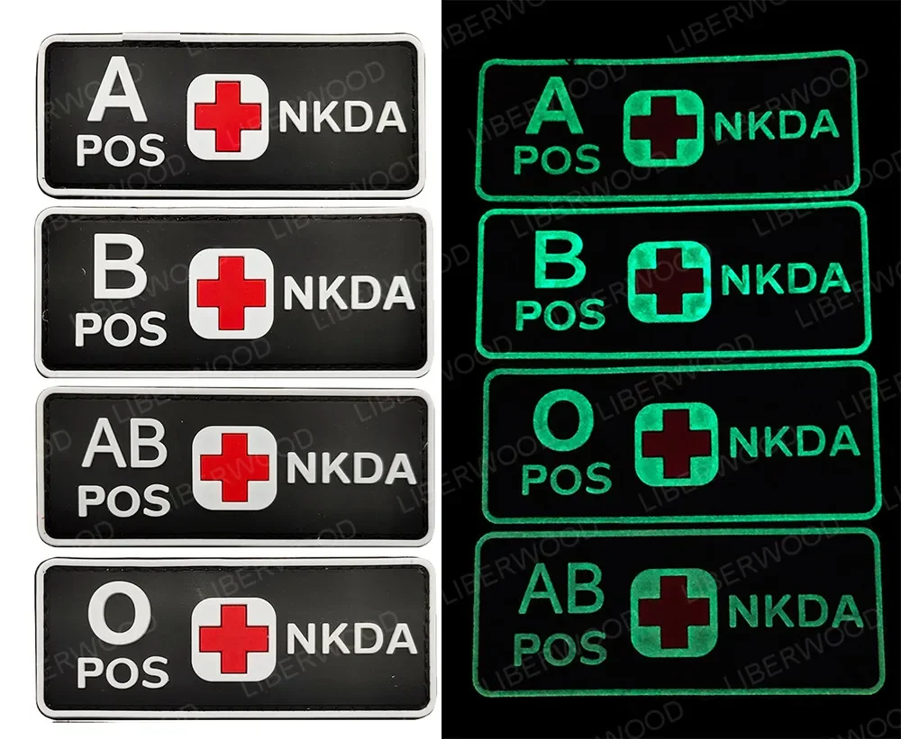 Parche de cruz roja NKDA tipo sangre A + B + O + AB + POS parche positivo insignia de parche militar MED médico que brilla en la oscuridad