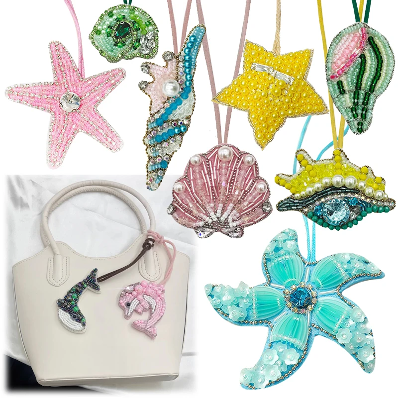 Dijes para bolsos, parches con cuentas, estrella de mar/concha/concha, colgante hecho a mano, dije colgante, joyería brillante con cuerda, regalo de Festival bohemio