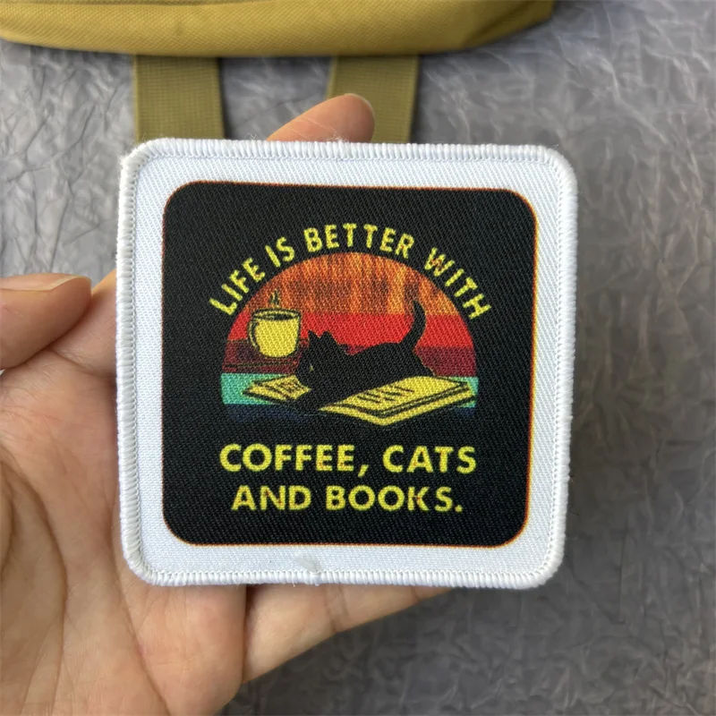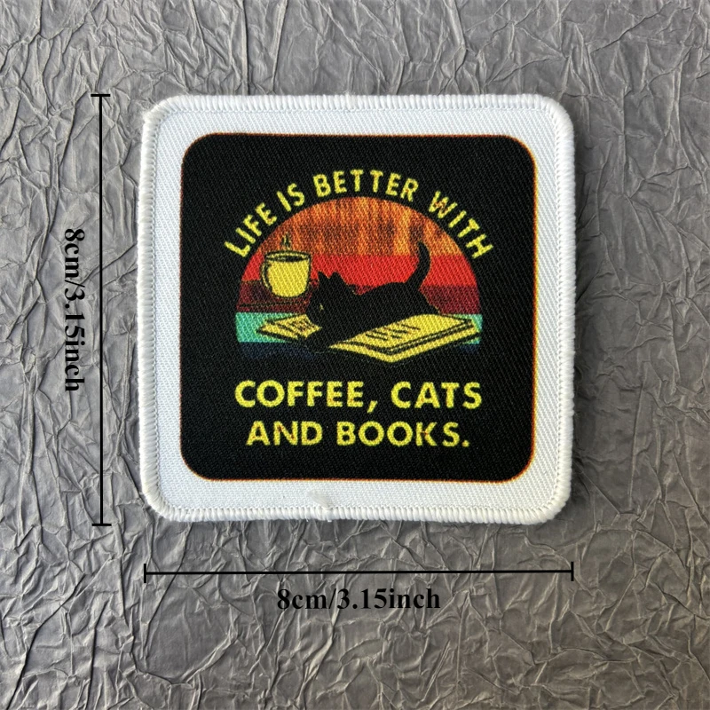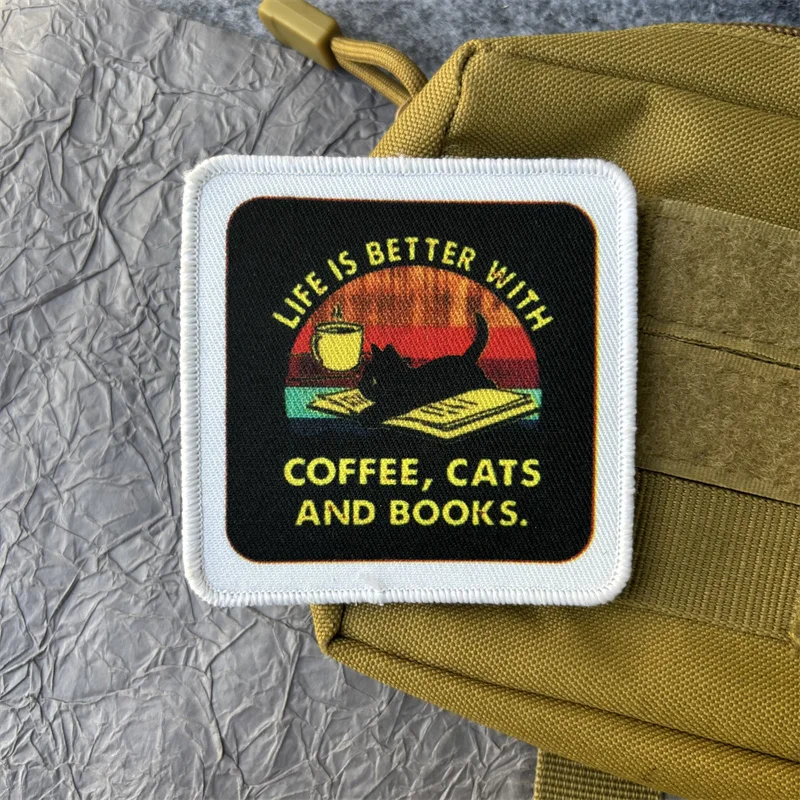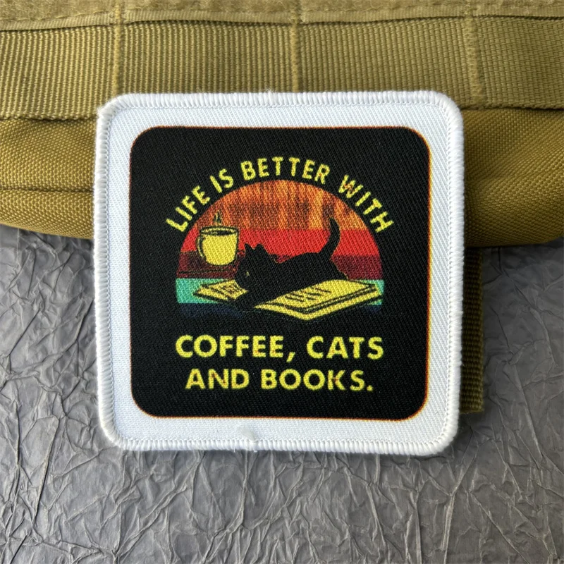 Parche estampado de "café, gatos y libros", ropa, insignia de moral táctica, parches militares con gancho y bucle, pegatinas para mochila