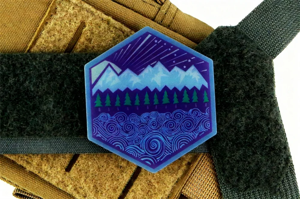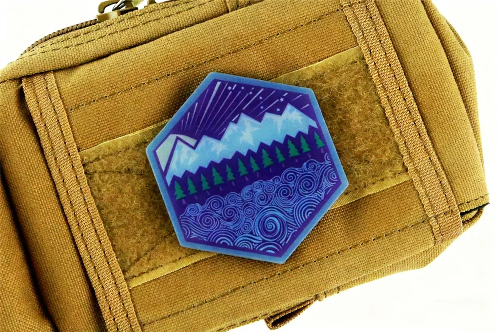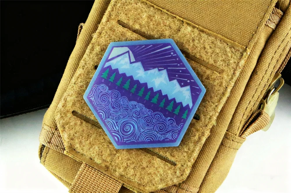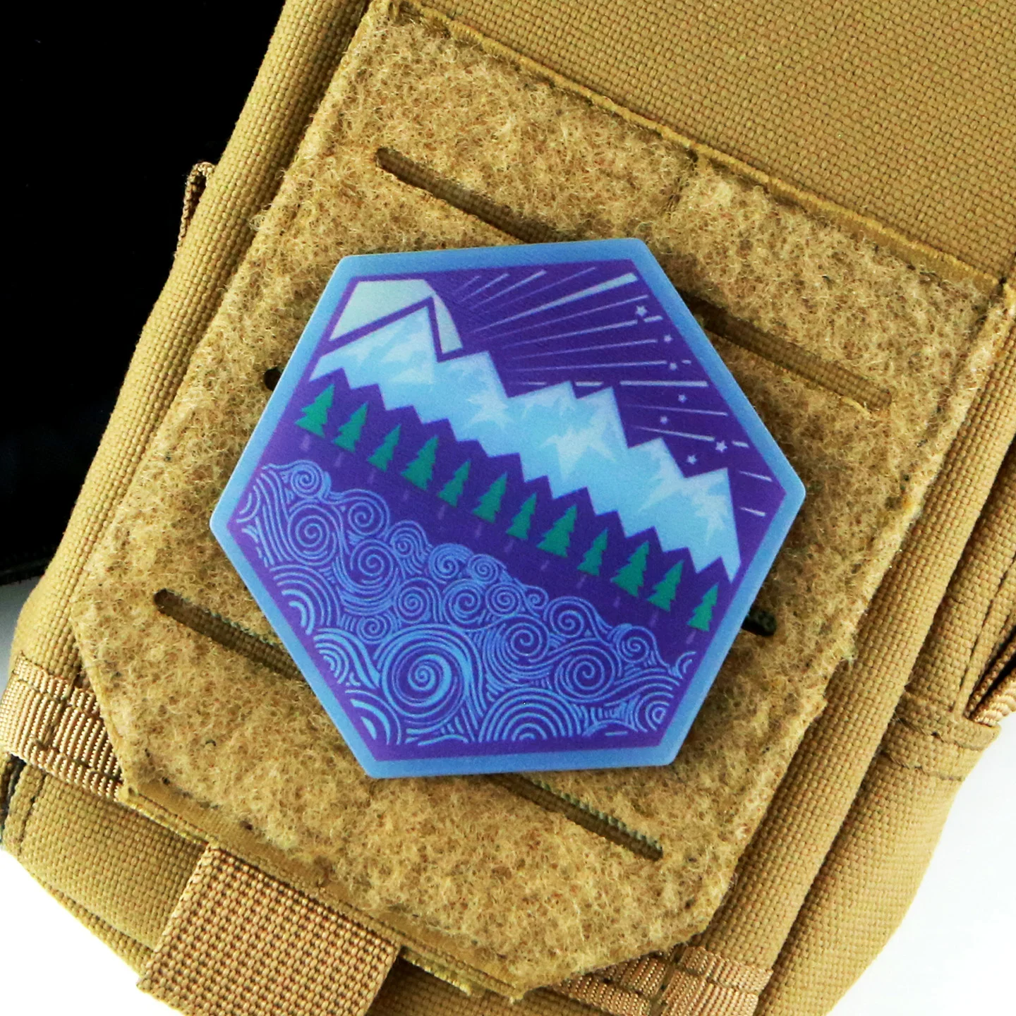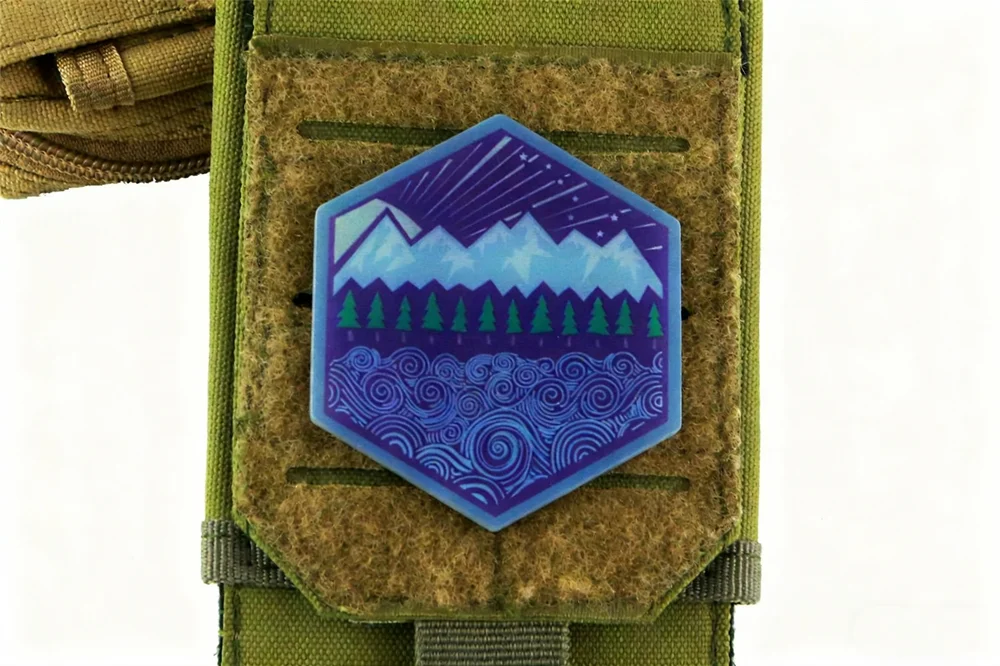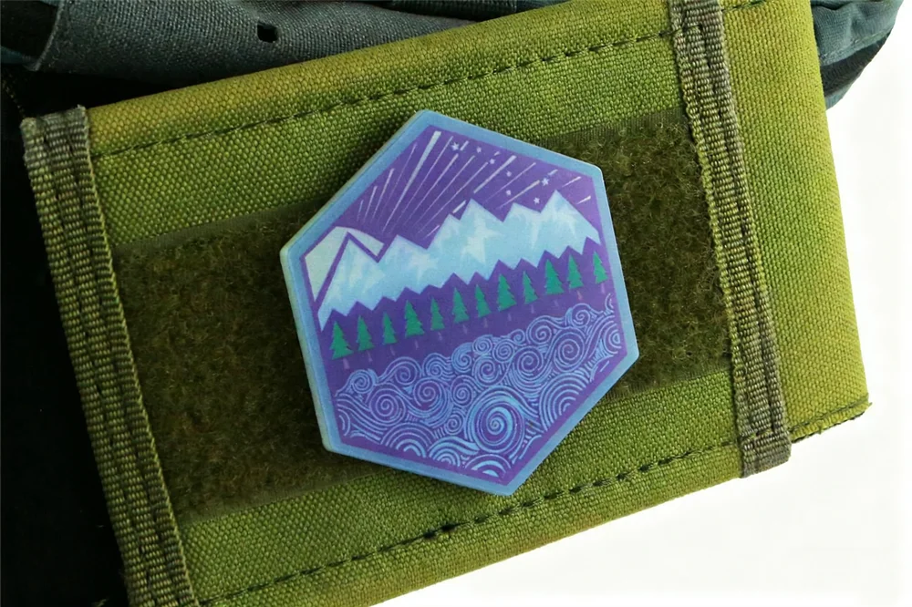 Parche Hexagonal de paisaje de bosque junto al río, brazalete táctico luminoso con impresión UV acrílica de montañas para decoración de bolsos