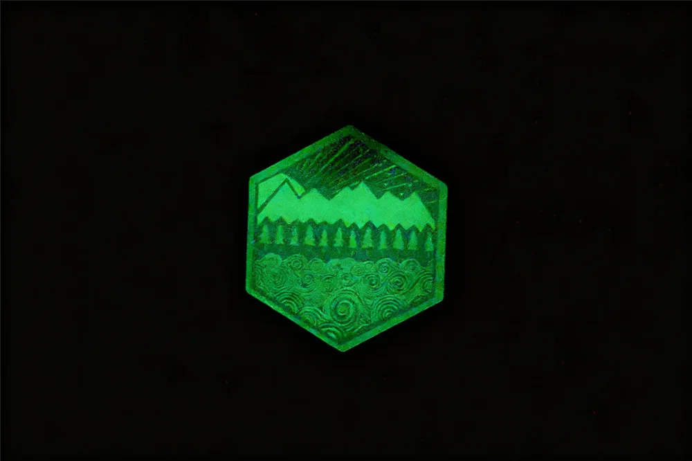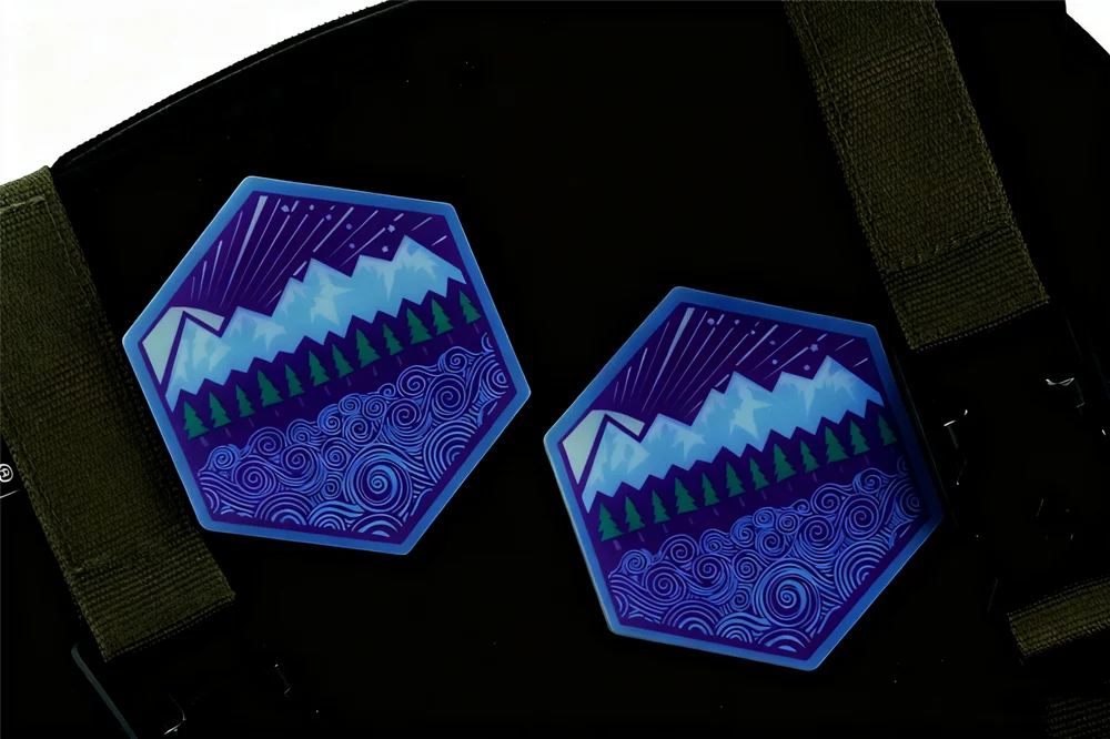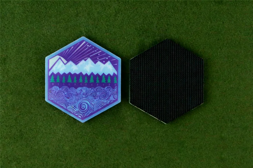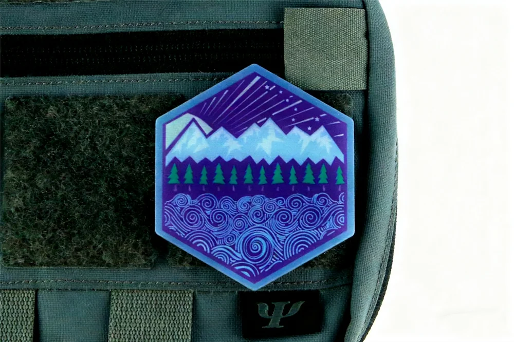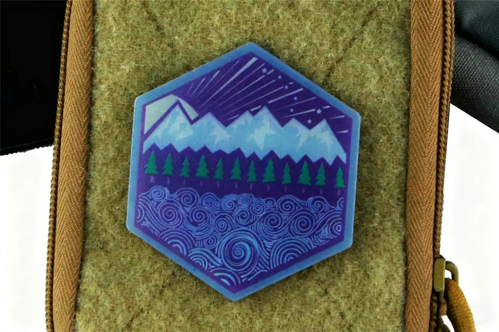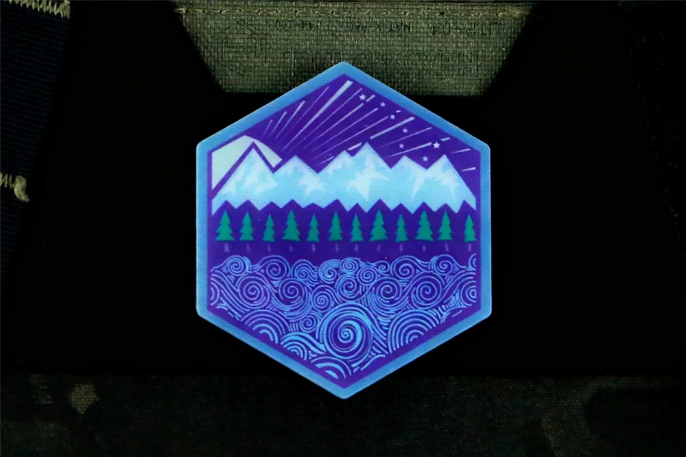 Parche Hexagonal de paisaje de bosque junto al río, brazalete táctico luminoso con impresión UV acrílica de montañas para decoración de bolsos