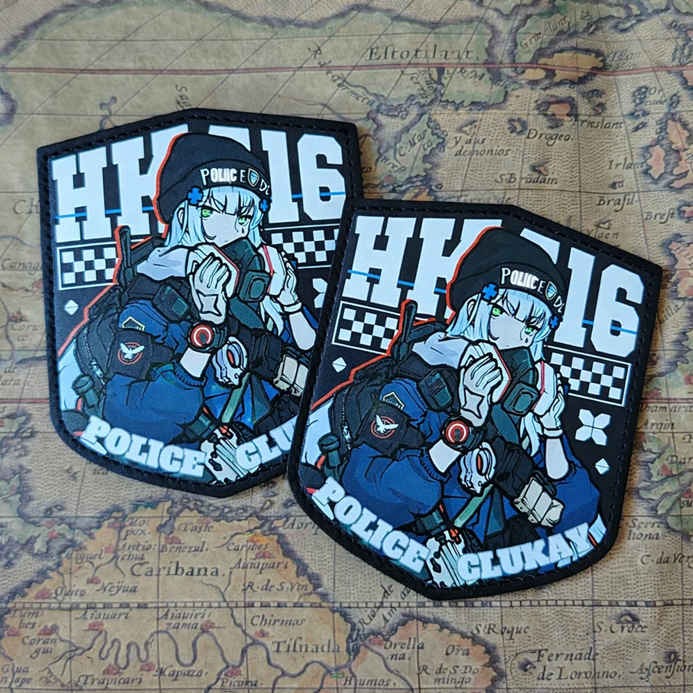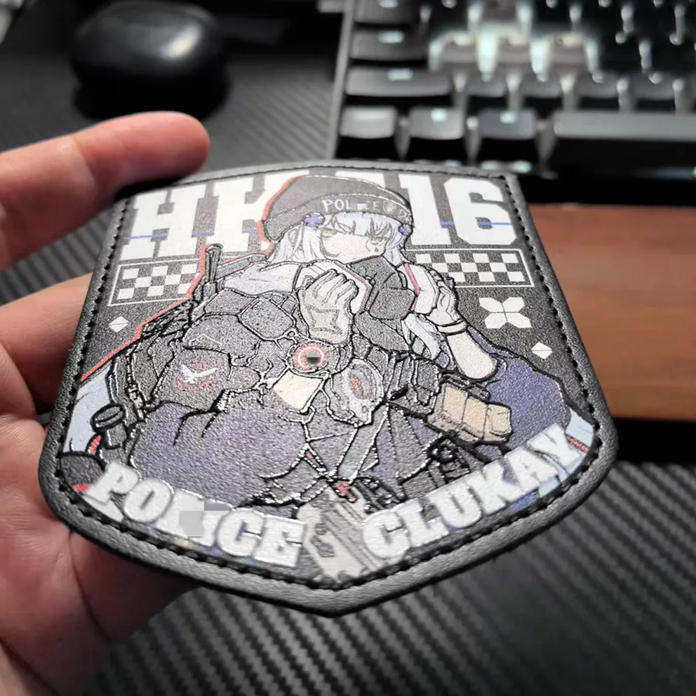 Nombre del producto: Parche HK416 de primera línea para niñasArtesanía: Estampado en caliente de cuero con ribete UVTamaño: Alto 10cmEspalda: con gancho