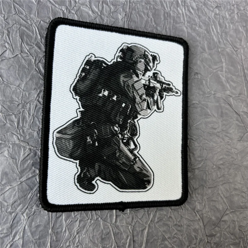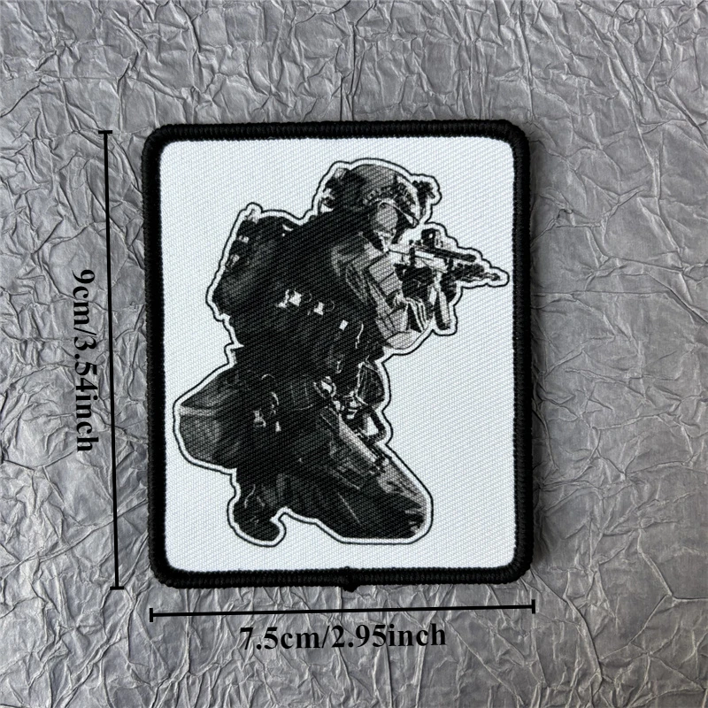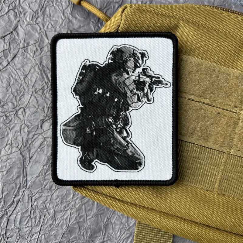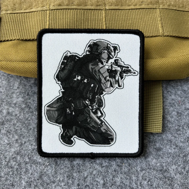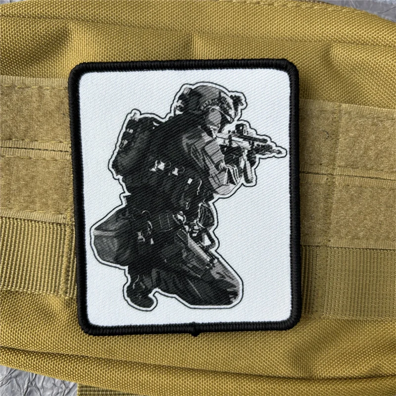 Un soldado con un parche impreso en pistola, accesorios tácticos y militares, insignia de moral, parches de gancho y bucle, pegatinas para mochila