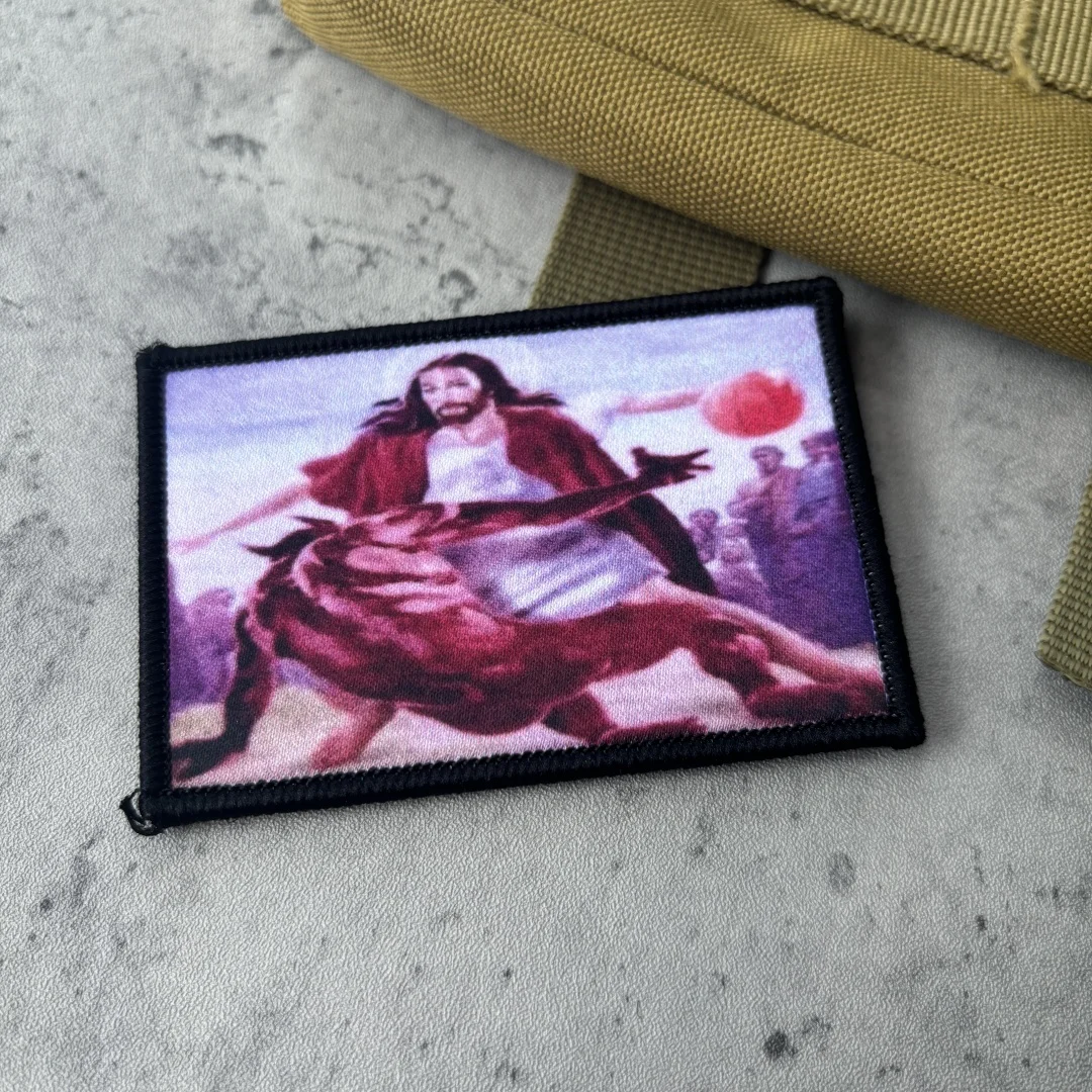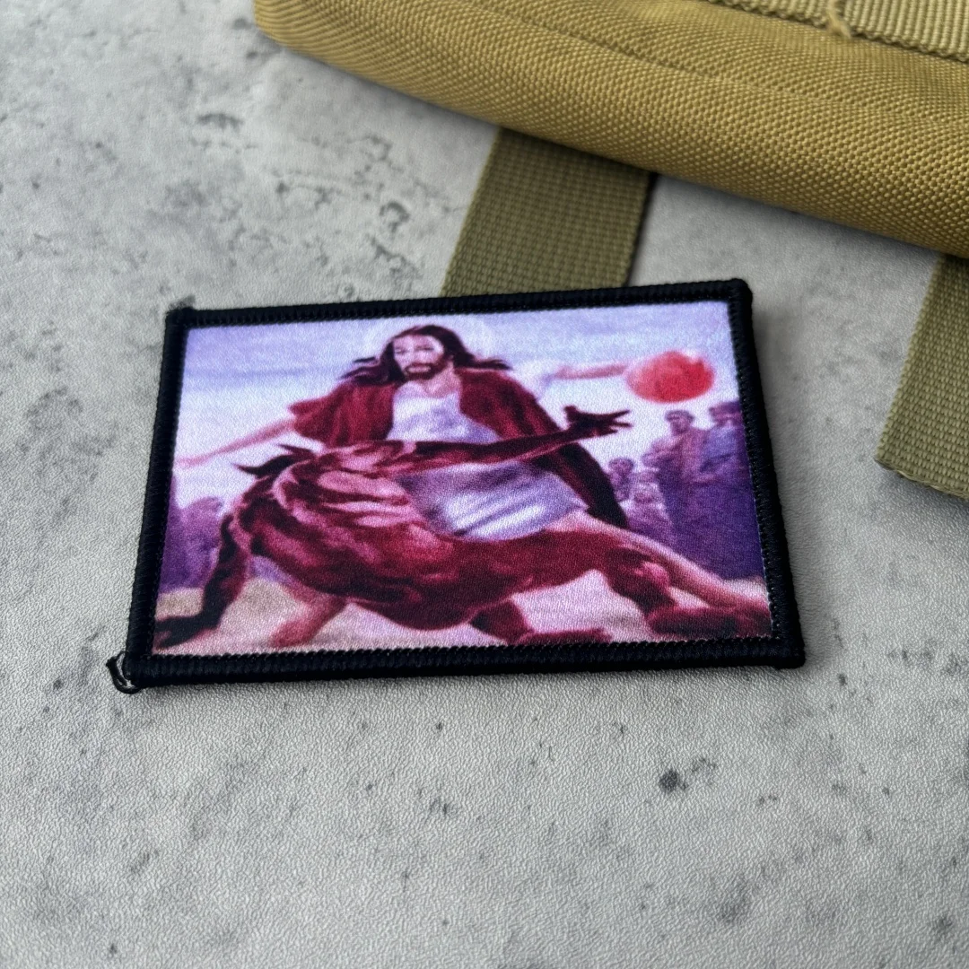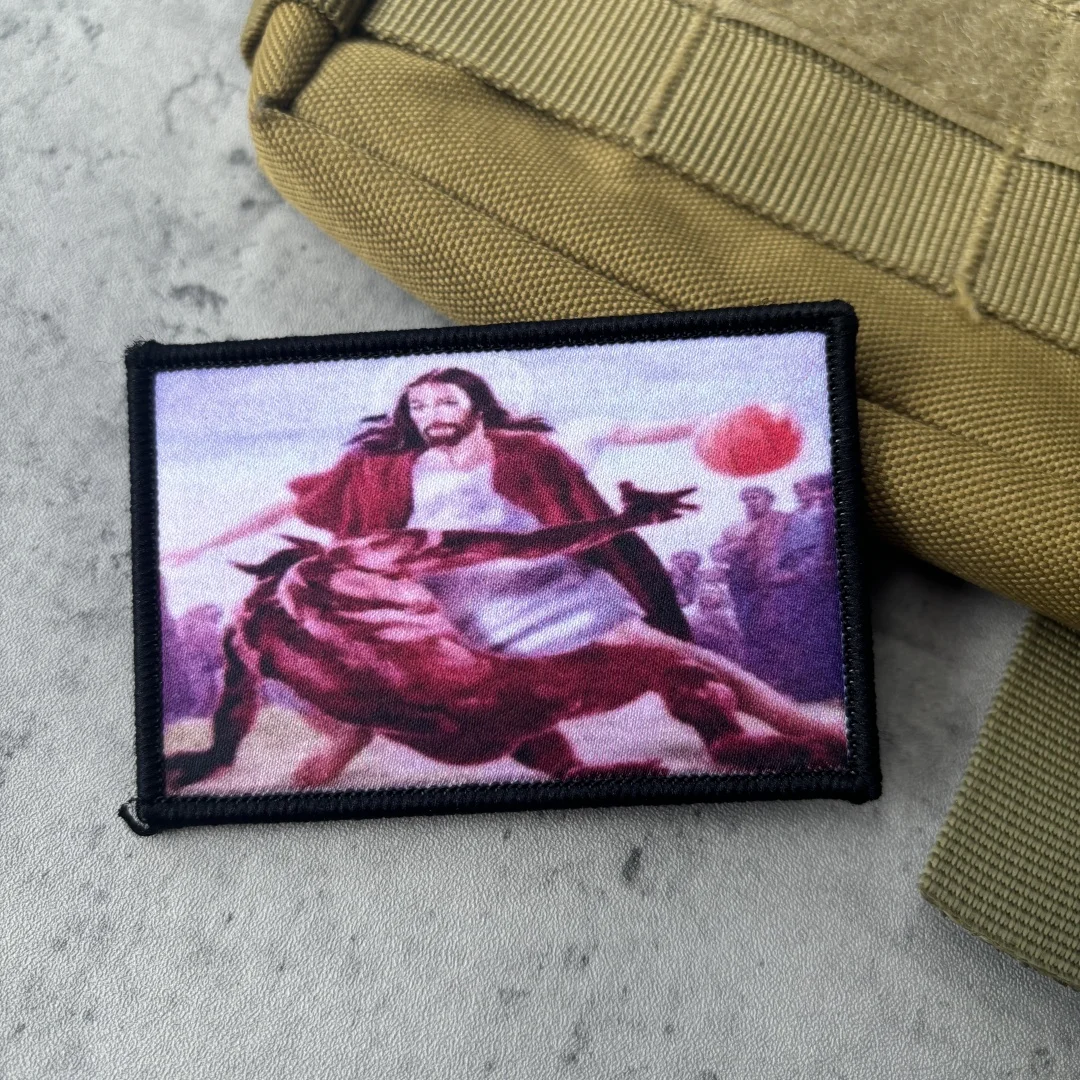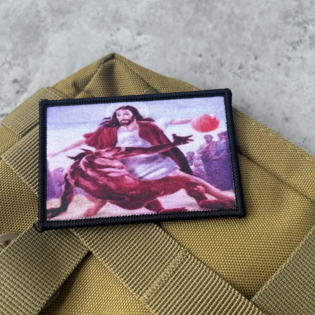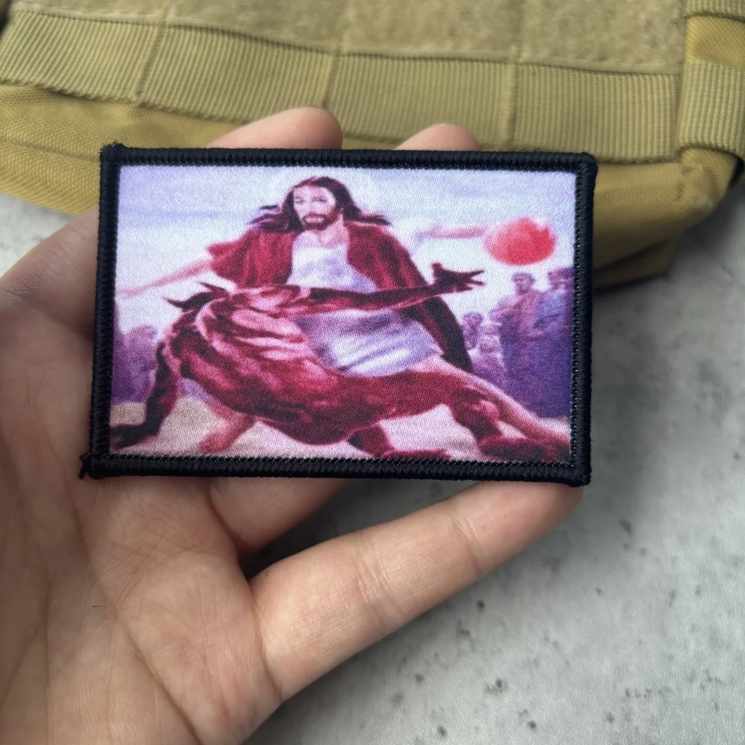 Parche Jesús Crossing The Devil, brazalete con estampado divertido, parches de moral táctica para ropa, mochila, insignia, apliques de gancho y bucle