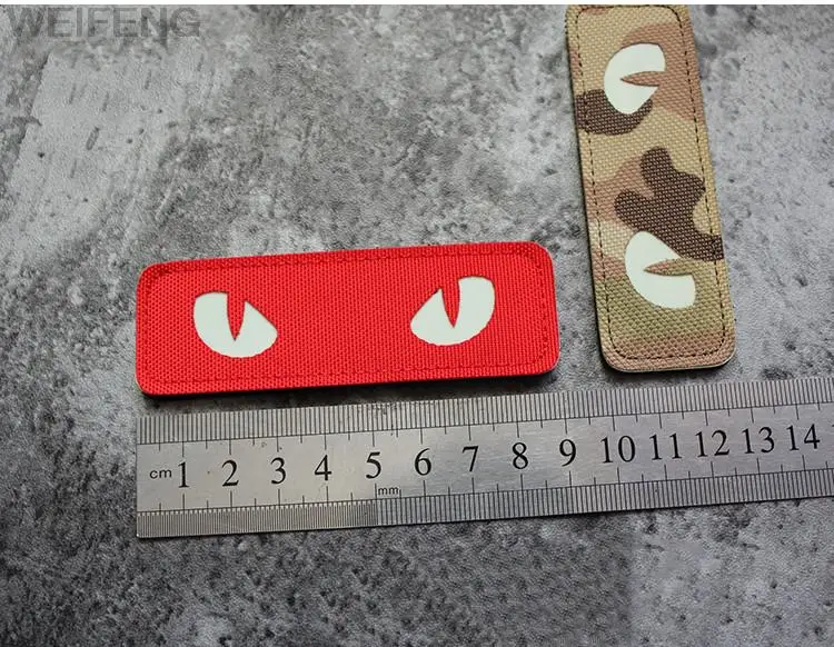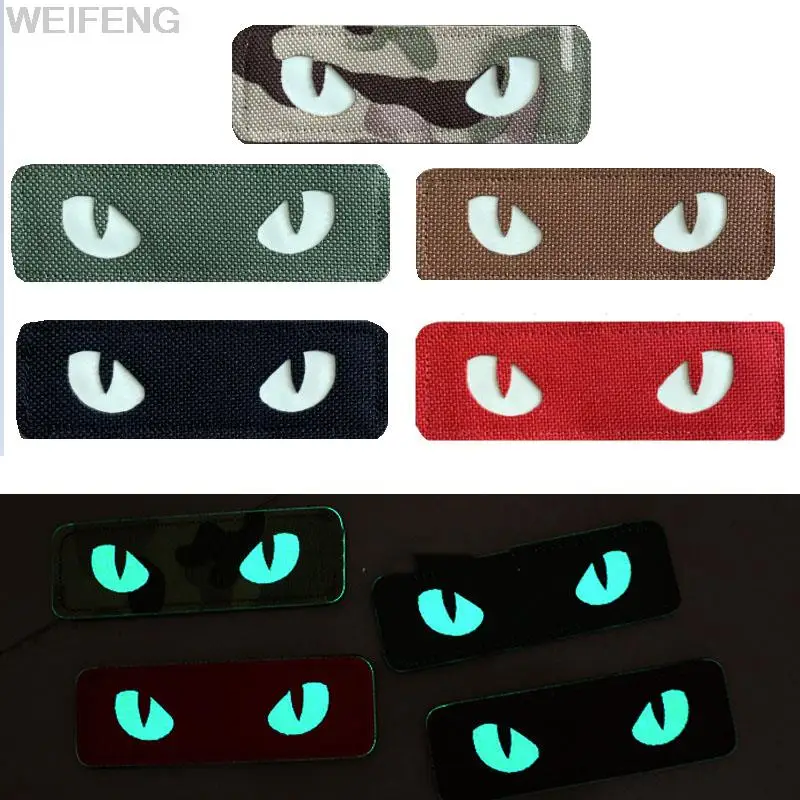 Nombre: brazaletes bordados luminosos de ojo de gato. Color: verde militar, marrón, Camuflaje, rojo, negro. Tamaño: 9x3cm. Artesanía: noctilucente. Embalaje: 1. Características de la ropa. Se puede conectar a ropa, mochilas, sombreros y otros artículos, DIY personalizado. Resalta la diferencia contigo