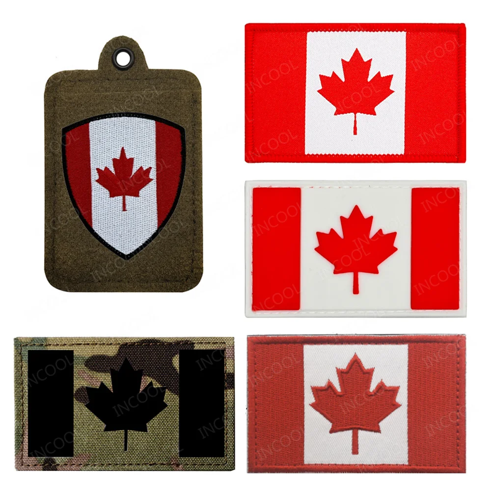 [Especificación]: Parche reflectante IR para bandera de Canadá, banderas canadiennes, parches bordados de hoja de arce, insignias de apliques tácticos luminosos de goma de PVC 3D
