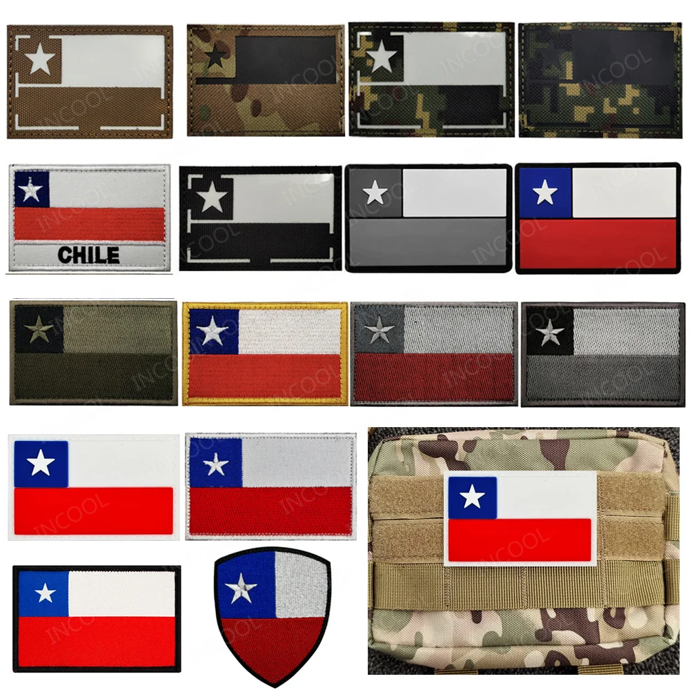 [Especificación]:Parche de bandera de Chile reflectante IR, banderas chilenas bordadas, insignias decorativas tácticas de goma de PVC con lazo para ropa, gorra de chaqueta