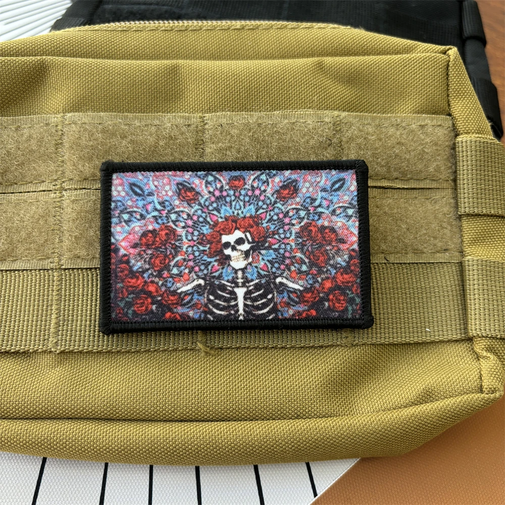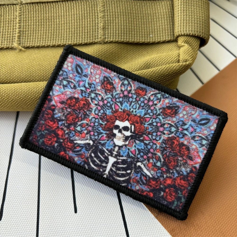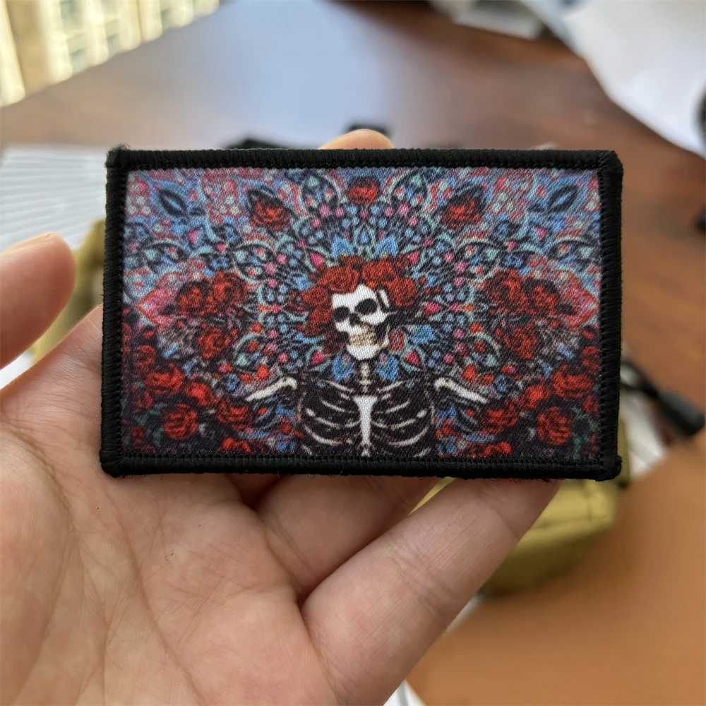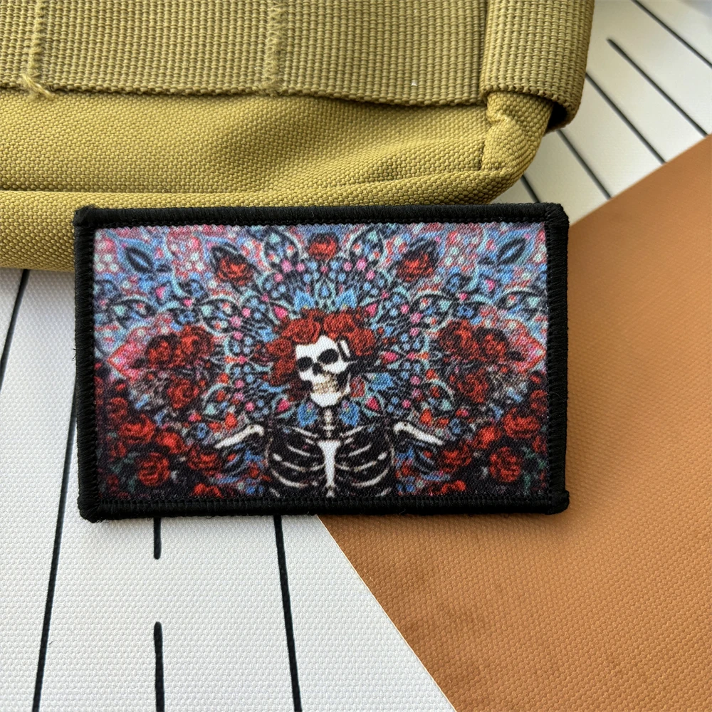 Calavera Rosa Parche táctico Esqueleto Estilo punk Moral Impreso Parches de gancho y bucle Insignia del ejército militar Brazalete DIY Mochila Pegatinas