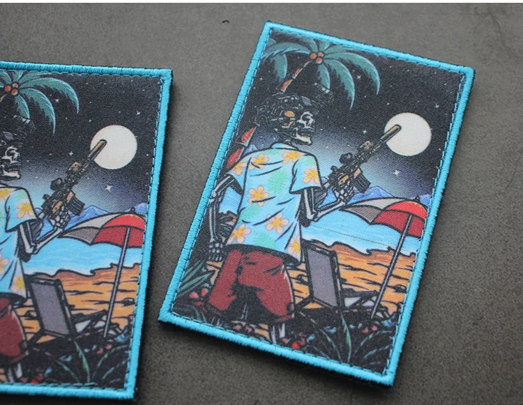 Parche táctico estampado de esqueletos de vacaciones para ropa, decoración de mochila, vista en la playa, playa y arena, insignia de Camping al aire libre