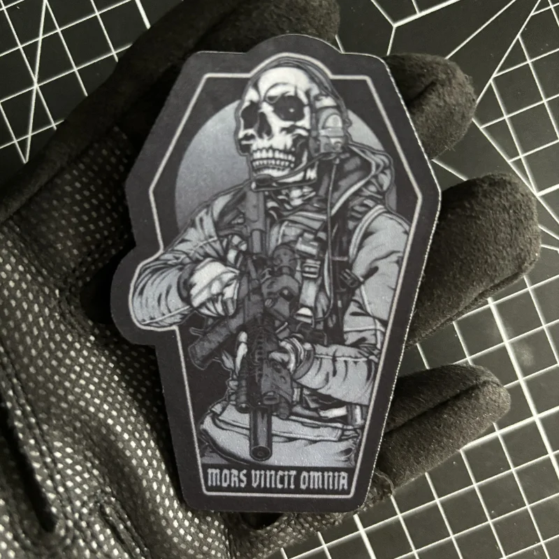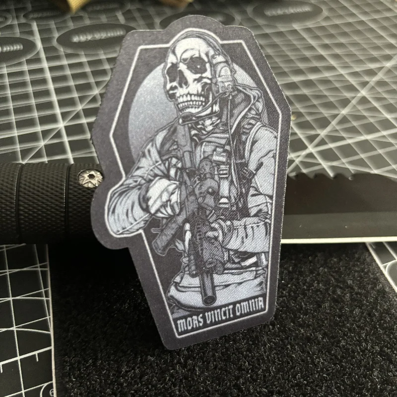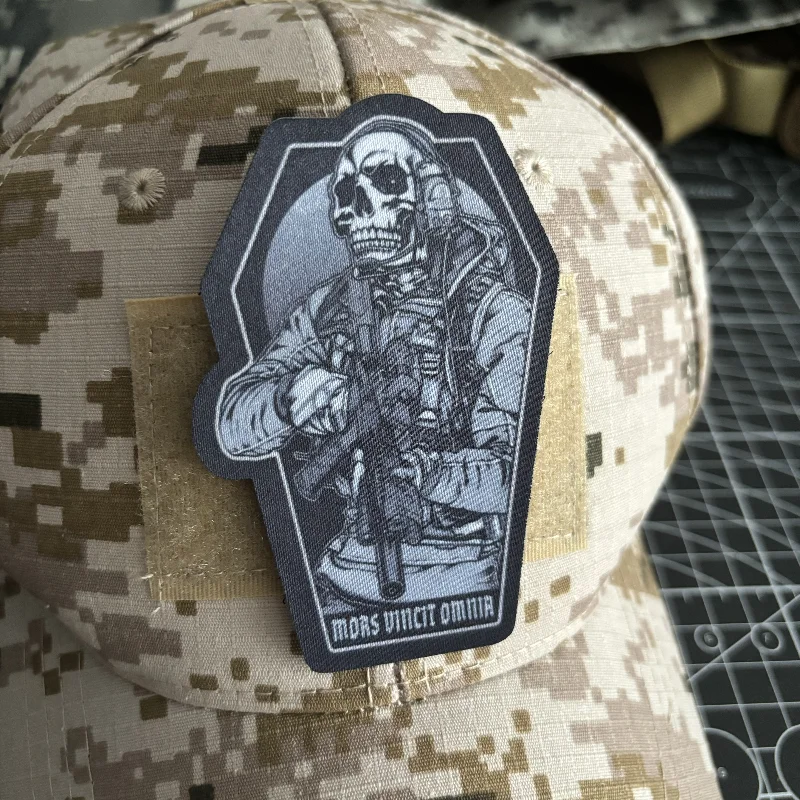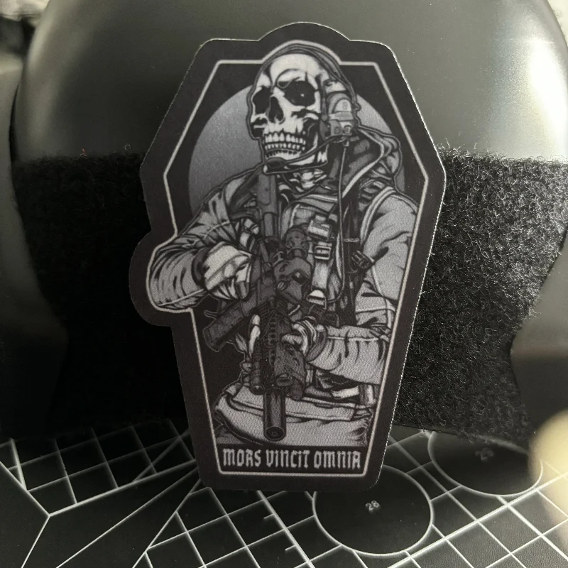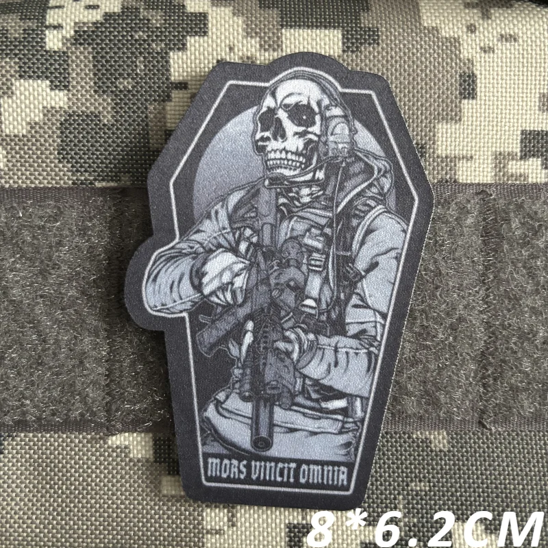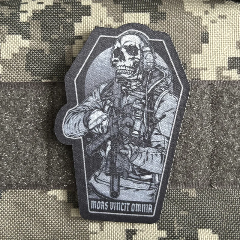 Parche táctico de guerrero esqueleto, insignia de moral de Mors Vincit Omnia, parches de impresión de gancho y bucle, brazalete militar, pegatina para mochila