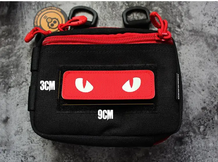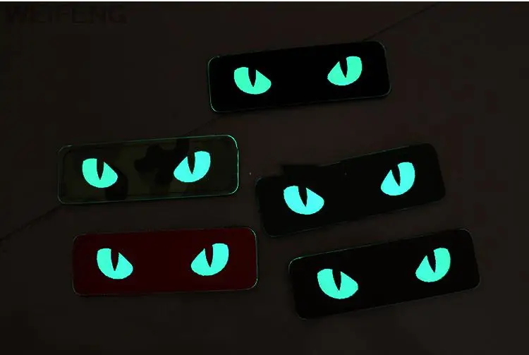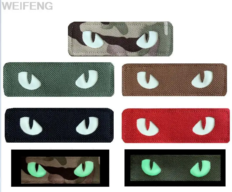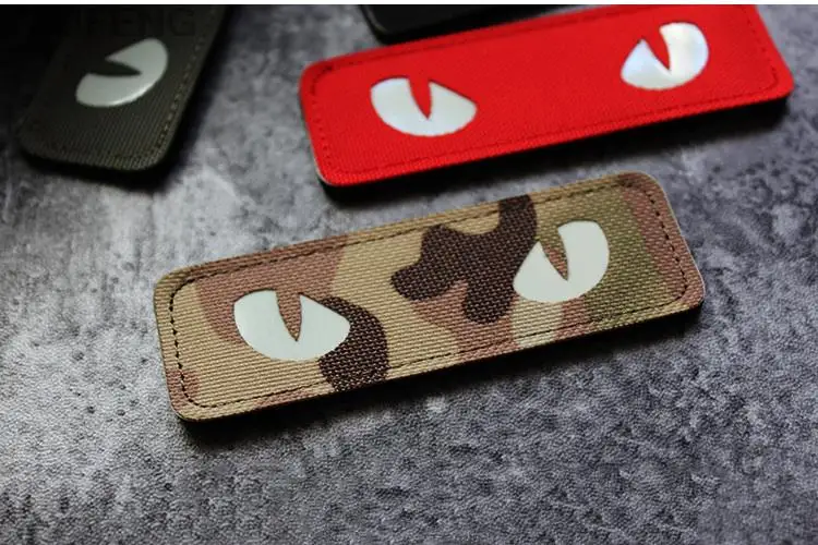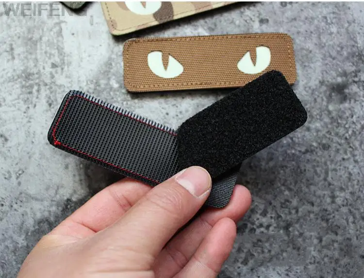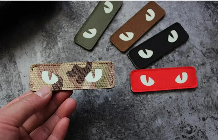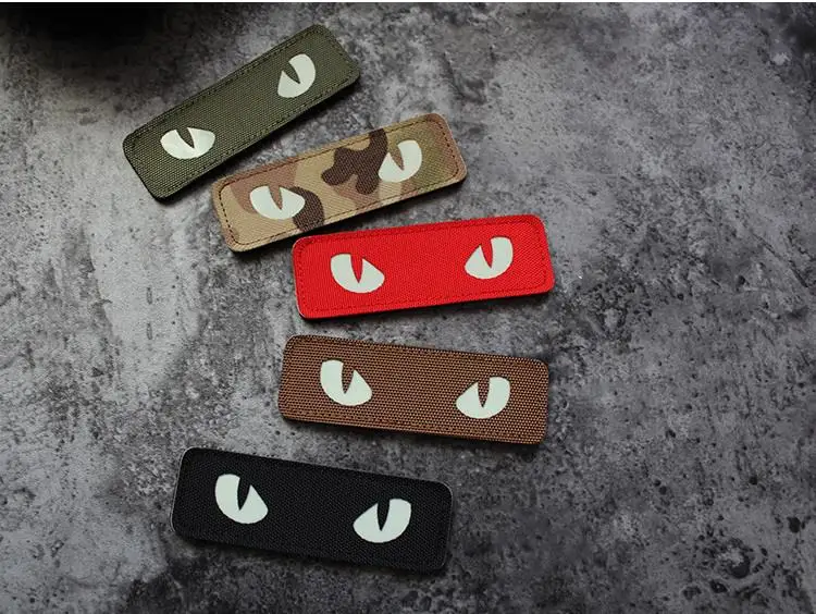 Nombre: brazaletes bordados luminosos de ojo de gato. Color: verde militar, marrón, Camuflaje, rojo, negro. Tamaño: 9x3cm. Artesanía: noctilucente. Embalaje: 1. Características de la ropa. Se puede conectar a ropa, mochilas, sombreros y otros artículos, DIY personalizado. Resalta la diferencia contigo
