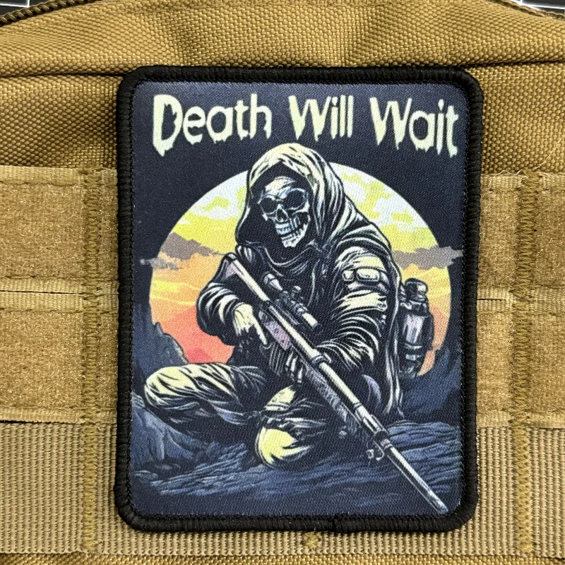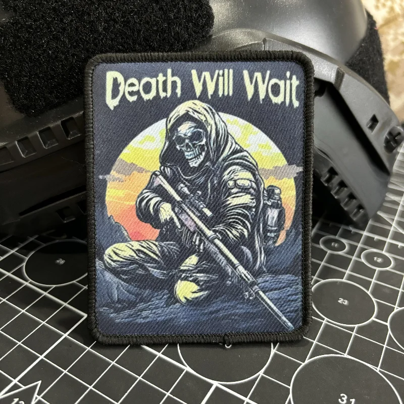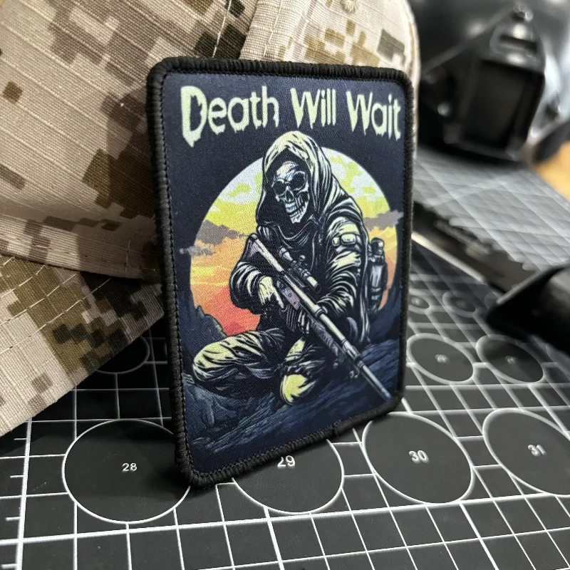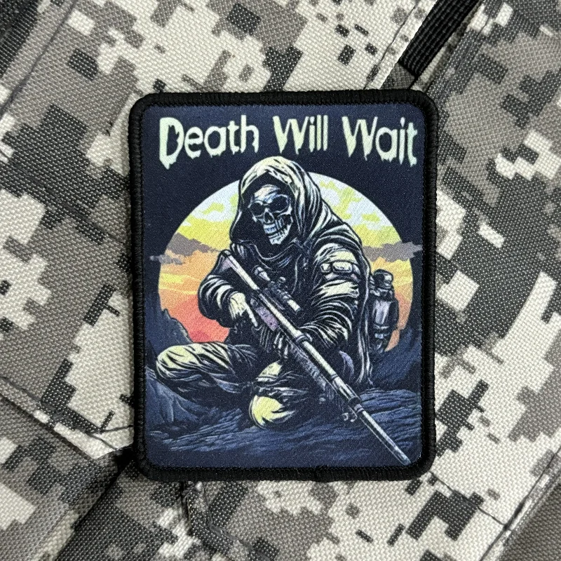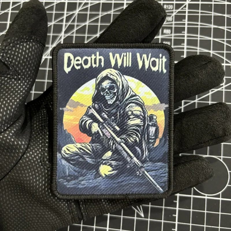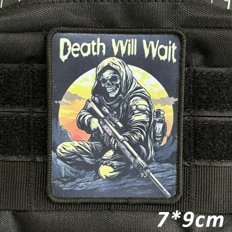 Parche táctico de soldado de calavera, la muerte esperará Reaper, insignia de moral, parches de impresión, gancho y bucle, brazalete militar, pegatina para mochila