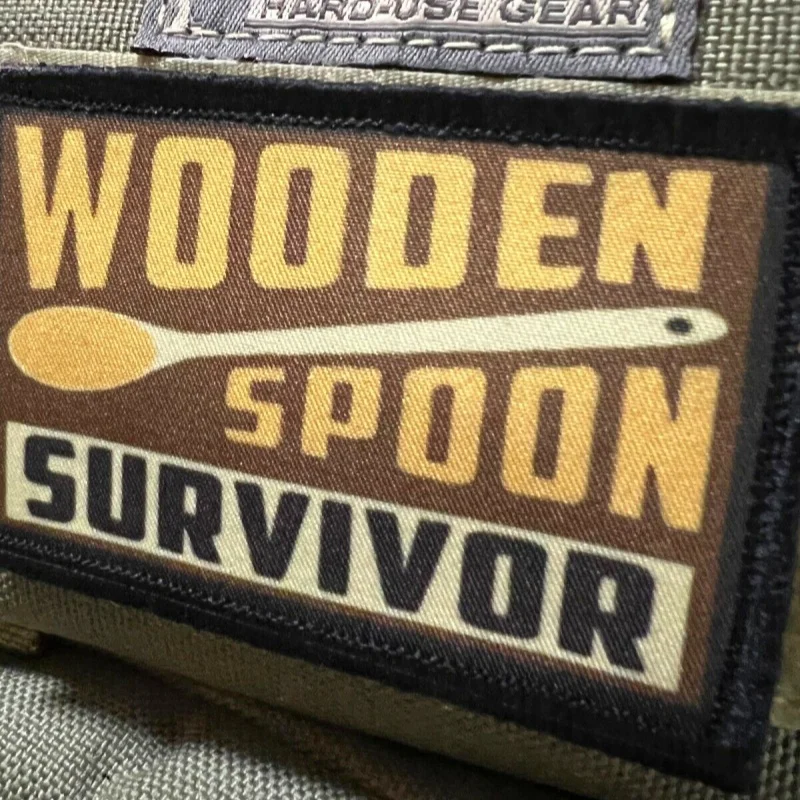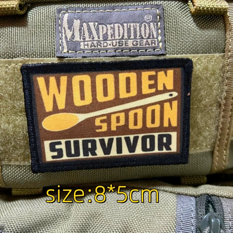Parche táctico de supervivencia, cuchara de madera, insignia de combate militar de EE. UU., insignia de brazalete, pegatinas de mochila, gancho y bucle, bordado divertido