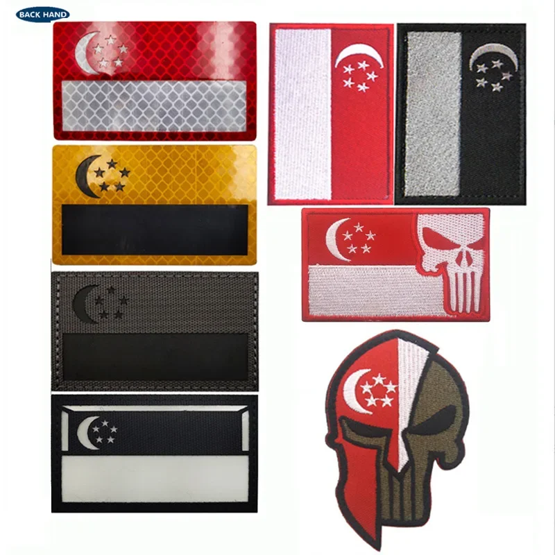 Parche de tela de bordado envoltura con insignia de Singapur, lámina reflectante cortada con láser, brazalete reflectante, parches militares para ropa