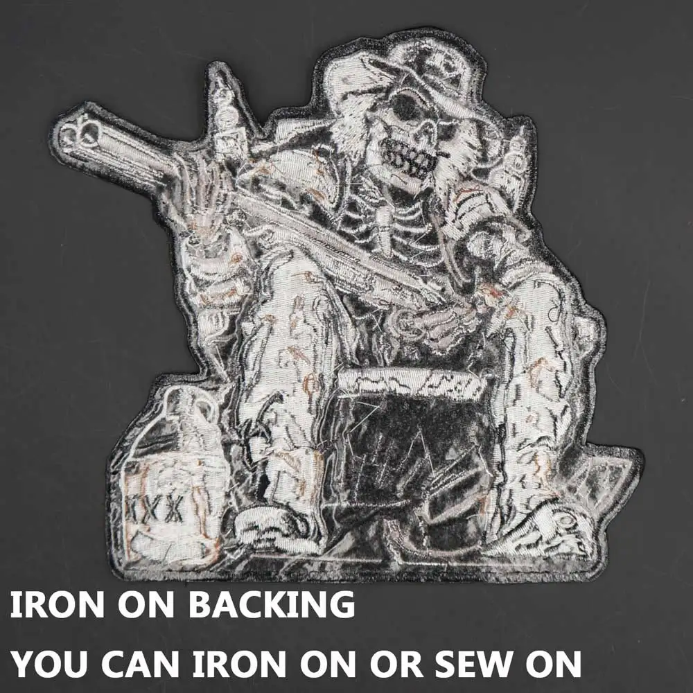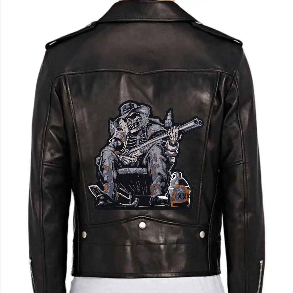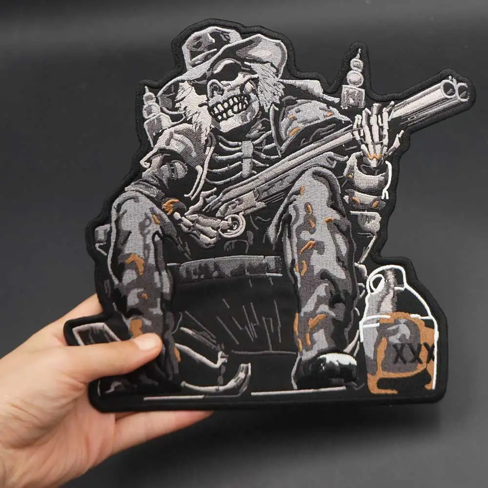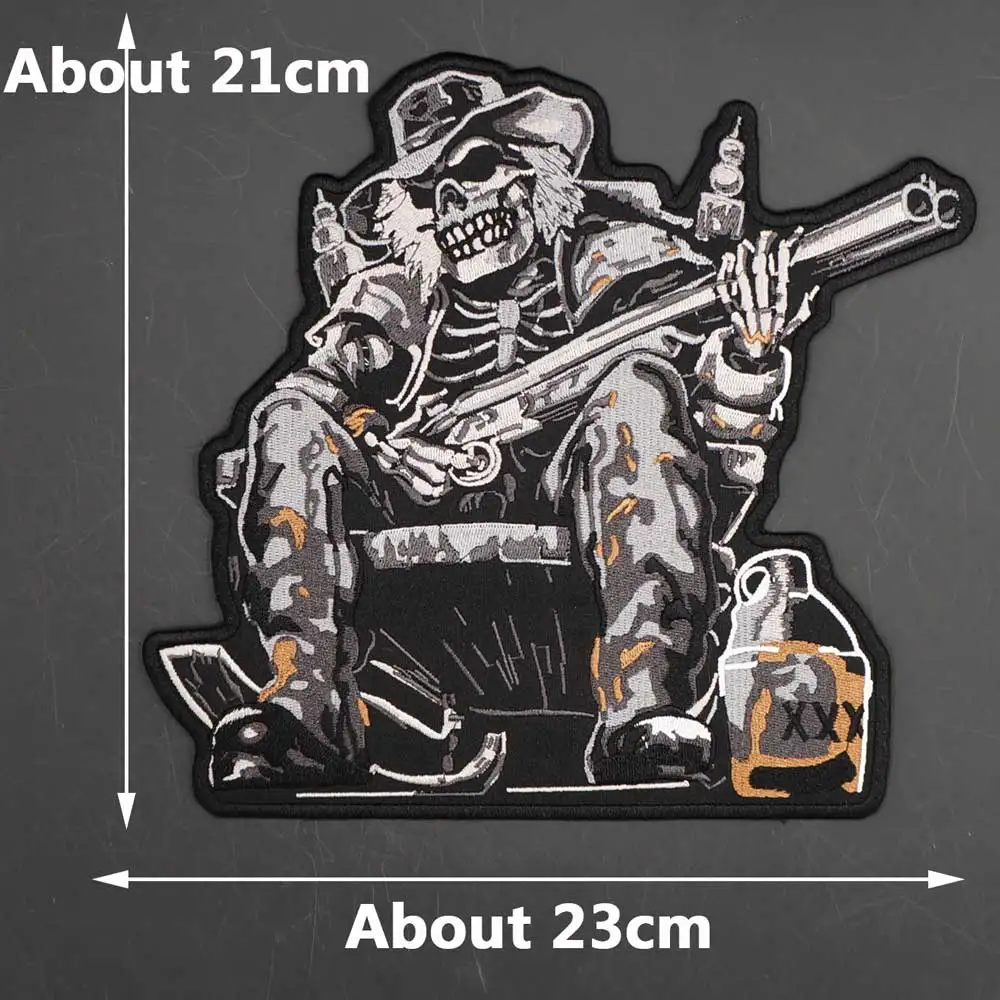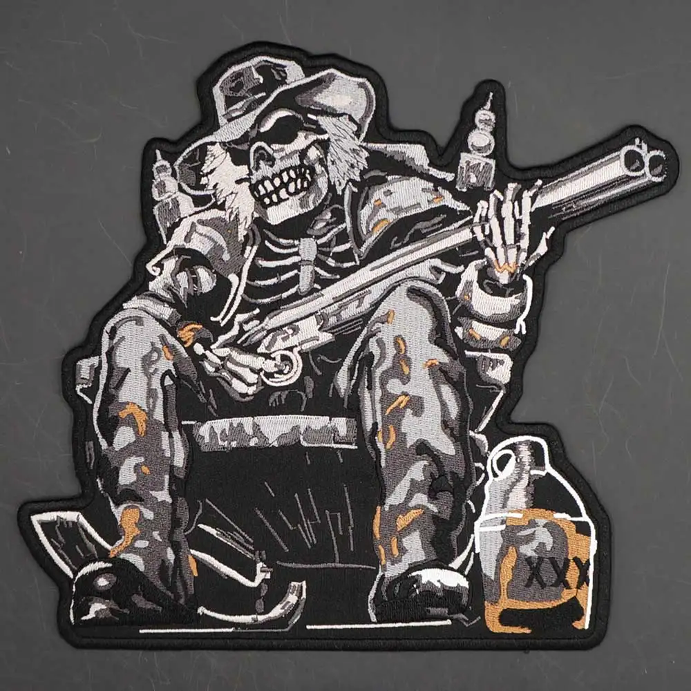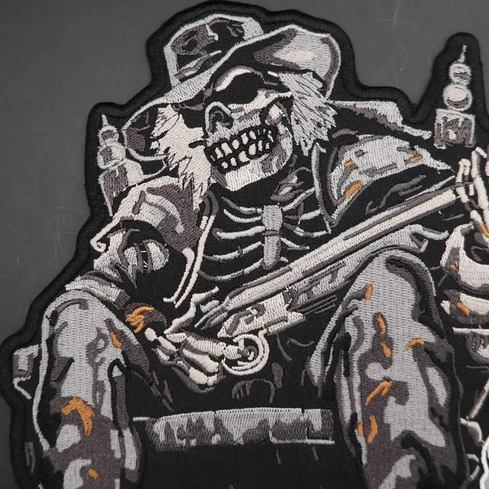 Parche de tela de sarga negra para parte posterior de chaqueta, chaleco bordado de calavera con pistola para motocicleta