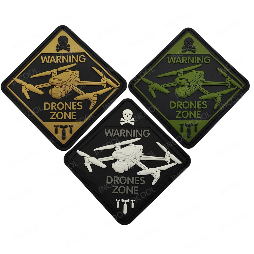[Especificación]:Parche de zona de drones de advertencia en la oscuridad, color blanco, goma de PVC, lazo de gancho piloto, parches de avión luminosos para casco, ropa, mochila