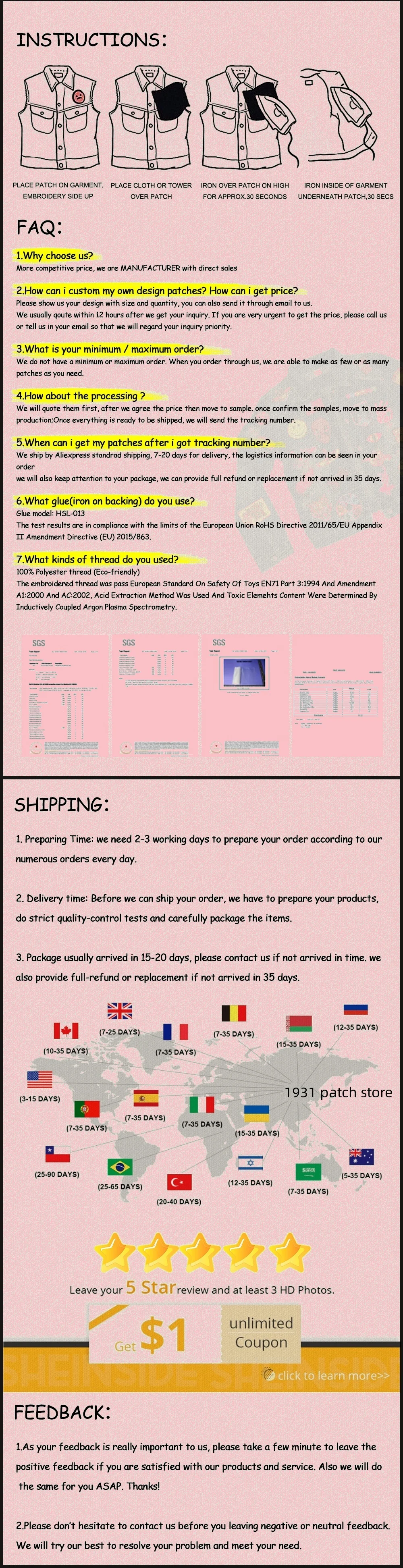 2. Los parches bordados se enviarán en 1-15 días hábiles una vez que haya pagado