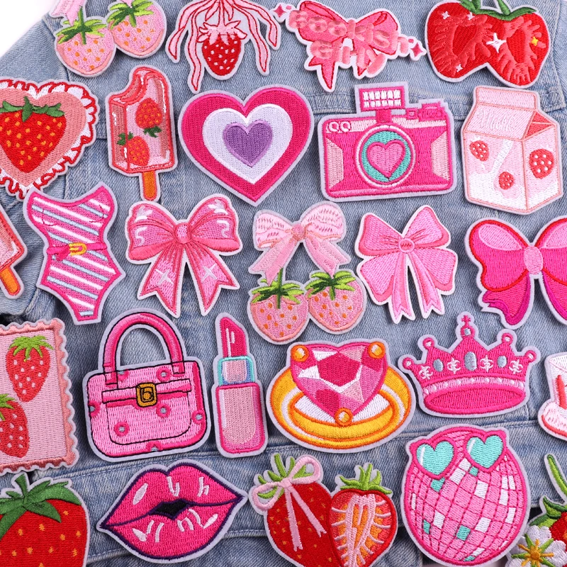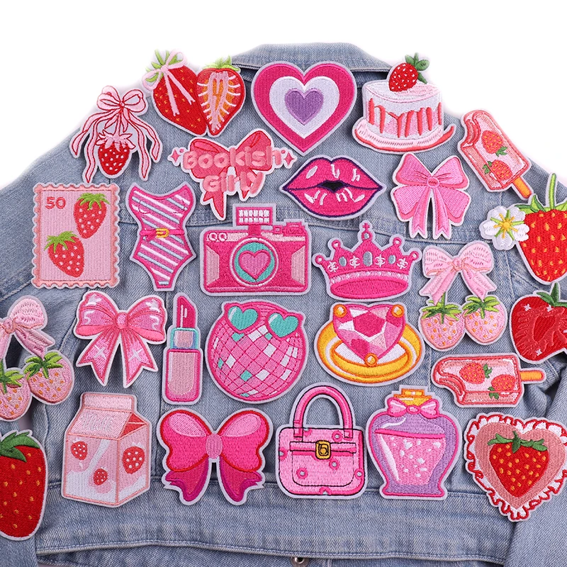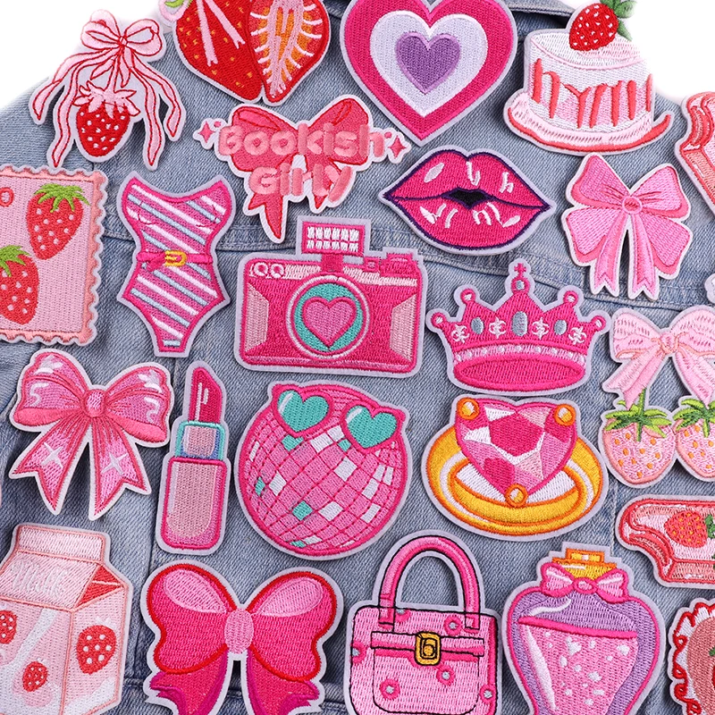 Parches bordados de corona de dibujos animados/cámara, parche de lápiz labial de discoteca, parches termoadhesivos para planchar para ropa, pegatinas para coser