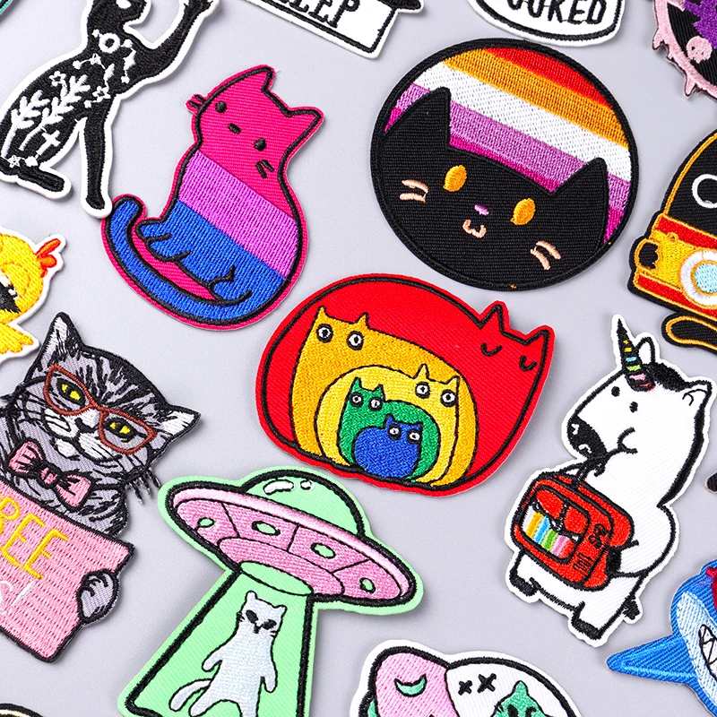 Parches bordados de gato arcoíris para ropa, parches termoadhesivos para planchar con dibujos animados, insignia a rayas, apliques, decoración de costura DIY