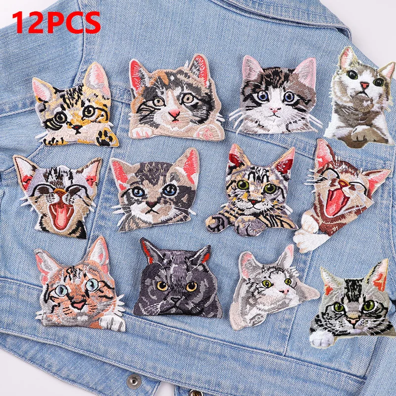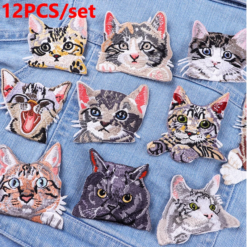 Parches bordados de gato de bolsillo para ropa, Parche de Animal de dibujos animados, para planchar, para ropa, chaqueta, pegatina bordada, 12 unids/set