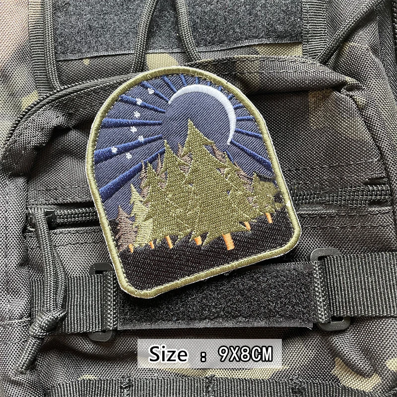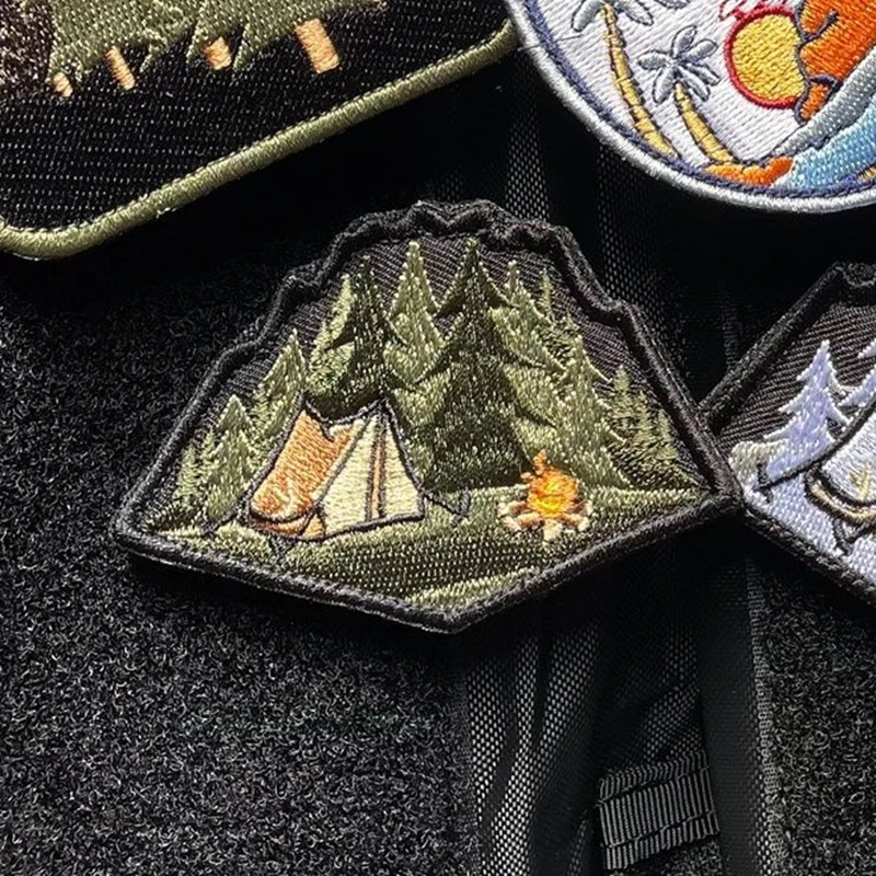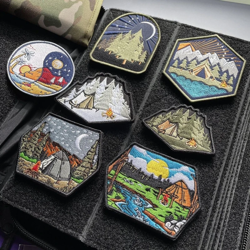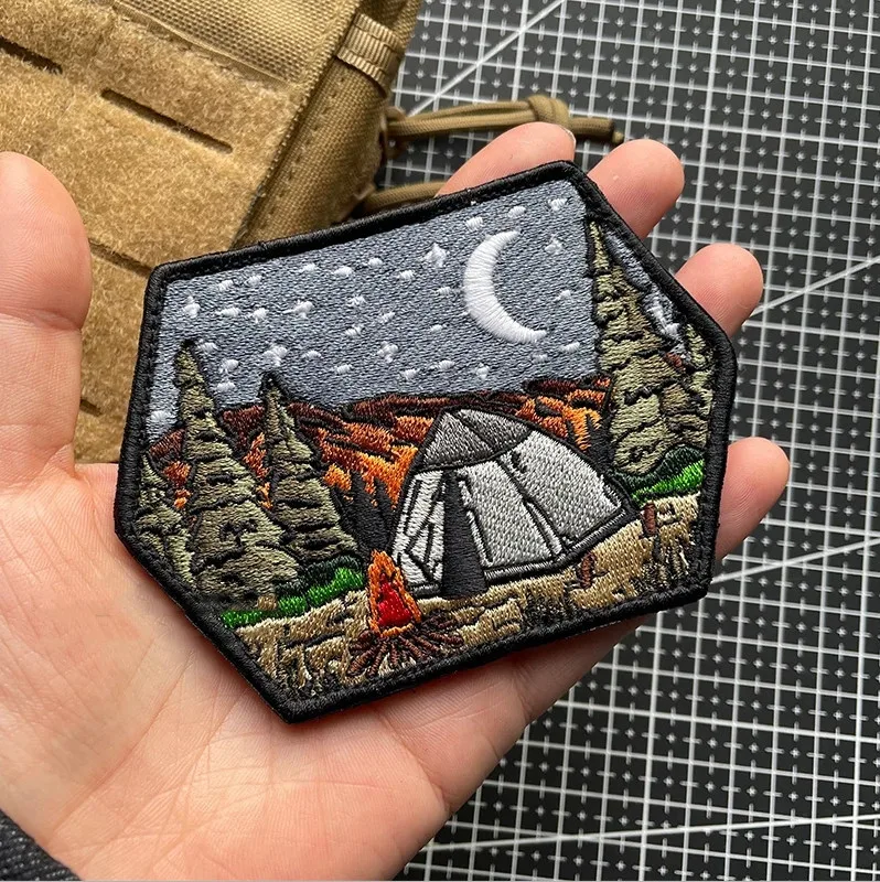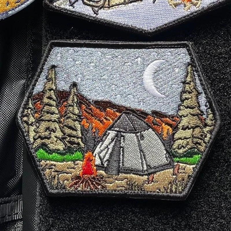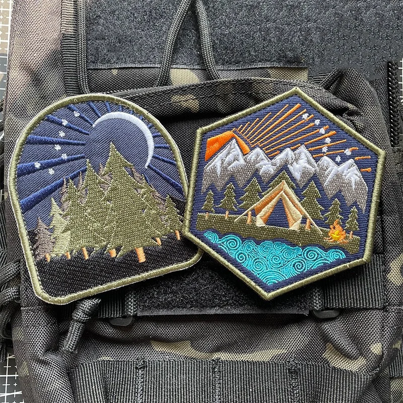 Parches bordados luminosos para todo terreno, insignia táctica de paisaje de montaña, decoración de rayas, bosque, Luna, sol, hoguera, tienda de campaña