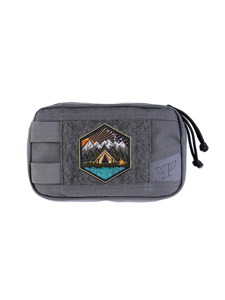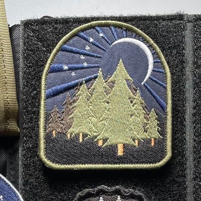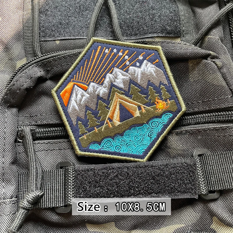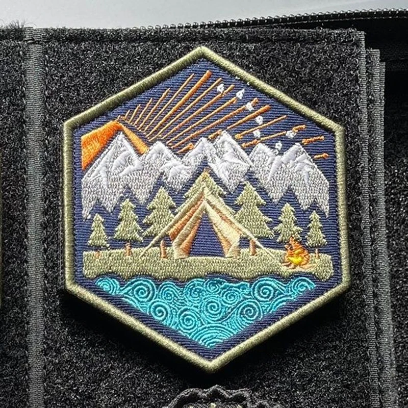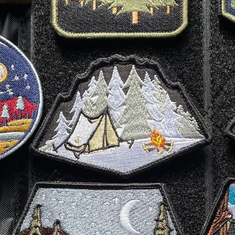 Parches bordados luminosos para todo terreno, insignia táctica de paisaje de montaña, decoración de rayas, bosque, Luna, sol, hoguera, tienda de campaña