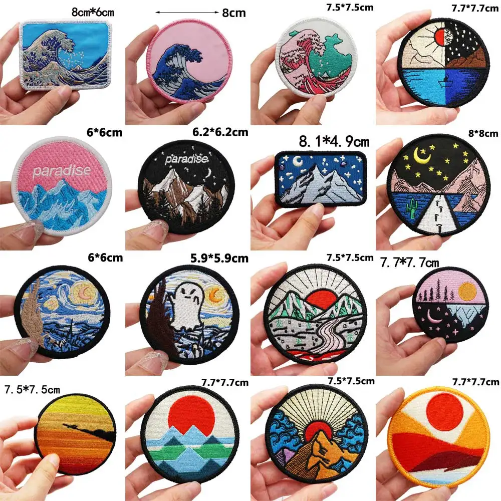 Parches bordados de mar, cielo estrellado, amanecer y atardecer, montañas, ríos, paisaje, apliques de costura con respaldo de gancho