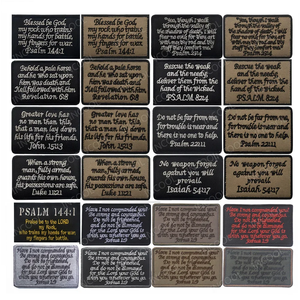 [Especificación]:Parches bordados inspiradores de la Biblia Hymns Psalm 144:1 BNW Joshua 1:9 Insignia de combate Ser sujetador fuerte y valiente