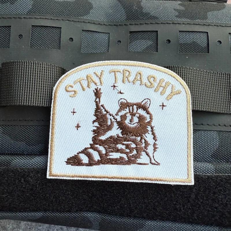 Parches bordados Stay Trashy Racoon, insignia de moral con gancho y bucle DIY para ropa, mochilas, sombreros, bolsos, apliques