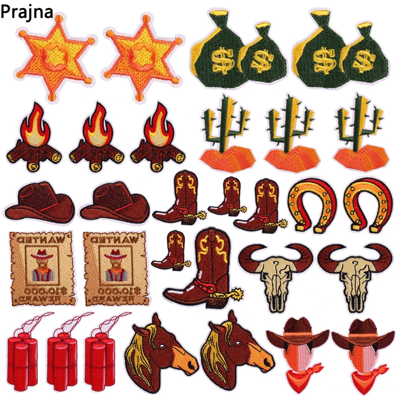 Parches bordados de vaquero del oeste de dibujos animados, 10 piezas, para ropa, sombreros, chaquetas, botas de caballo, Parche de cabeza de toro, parches para planchar, insignia para coser