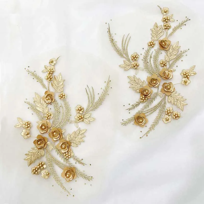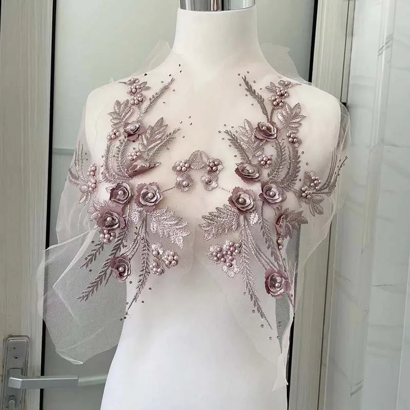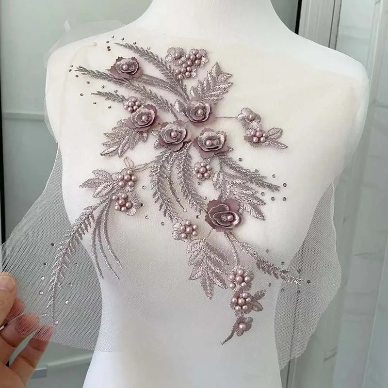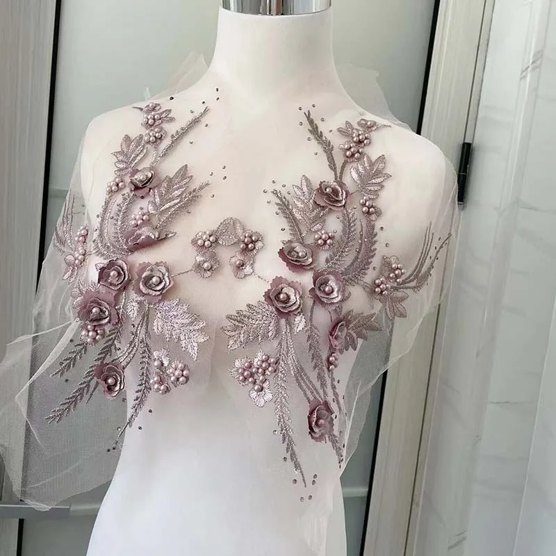 Parches de cuentas de diamantes de imitación, suministros de costura, apliques de flores 3d, tela de encaje bordado, coser parches para vestido, 1 par = 2 piezas/32x21CM