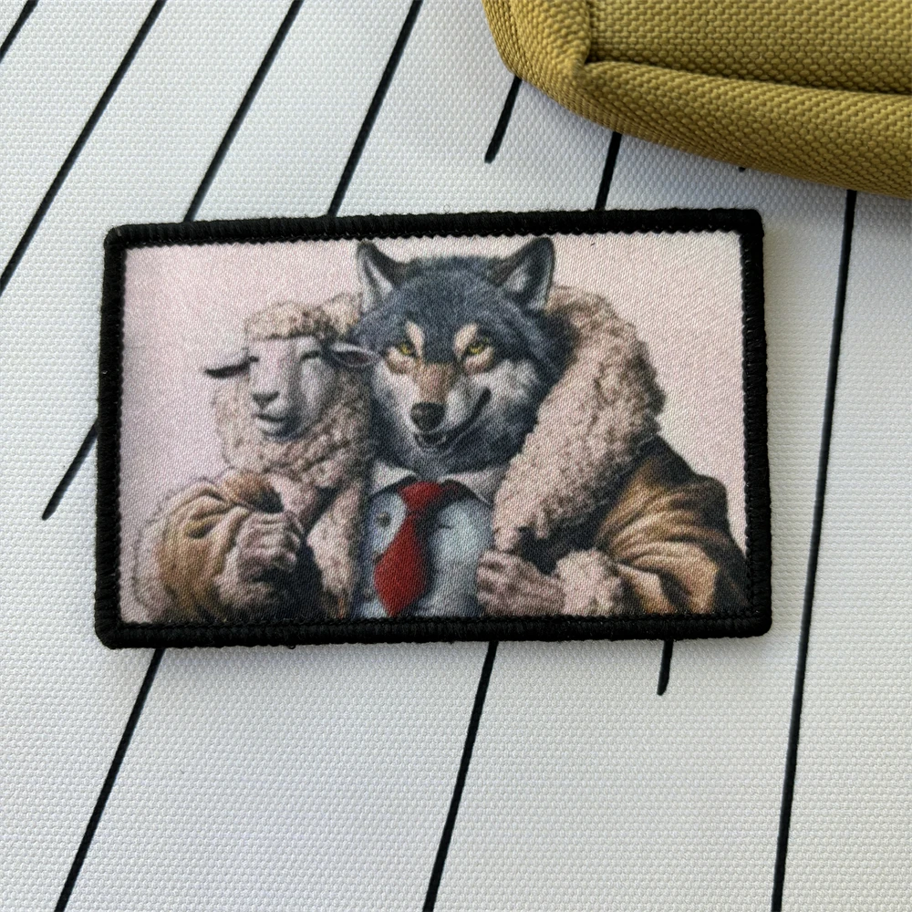 Parches de impresión de lobo en oveja de dibujos animados, Parche de gancho y bucle para brazalete en la ropa, insignia de moral militar, pegatinas tácticas para mochila