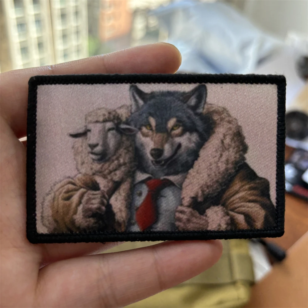 Parches de impresión de lobo en oveja de dibujos animados, Parche de gancho y bucle para brazalete en la ropa, insignia de moral militar, pegatinas tácticas para mochila
