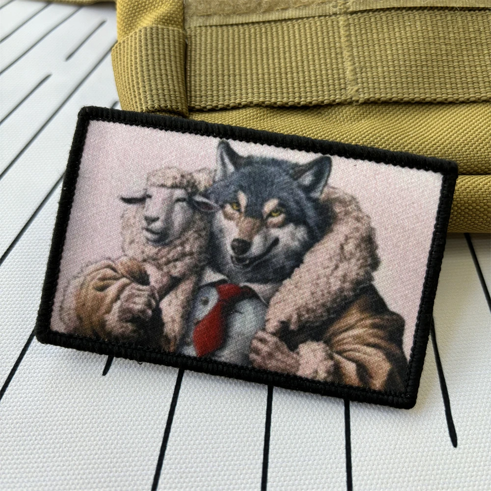 Parches de impresión de lobo en oveja, brazalete de dibujos animados, Parche de gancho y bucle en la ropa, insignia de moral militar, pegatinas tácticas para mochila