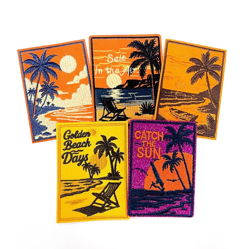 Parches de insignia bordados para coser, rectángulo, puesta de sol, árboles de playa, DIY, camiseta, sombrero, mochila, ropa, pegatina con apliques
