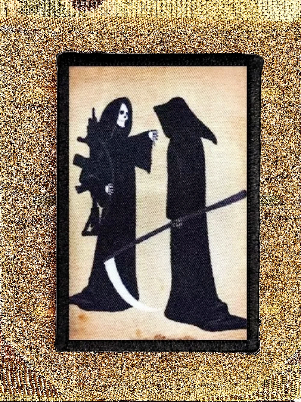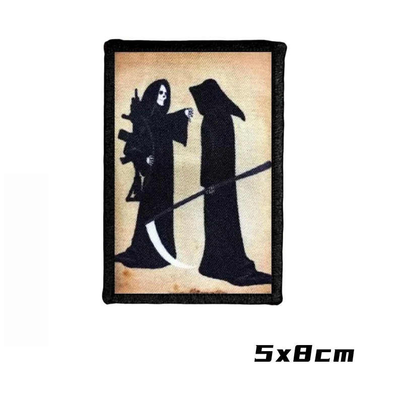 Parca DE LA Parca con un AR15 que da el 'pulgar abajo' al estilo antiguo Sycthe "Parches de insignia de moral Pegatinas de gancho y bucle táctico